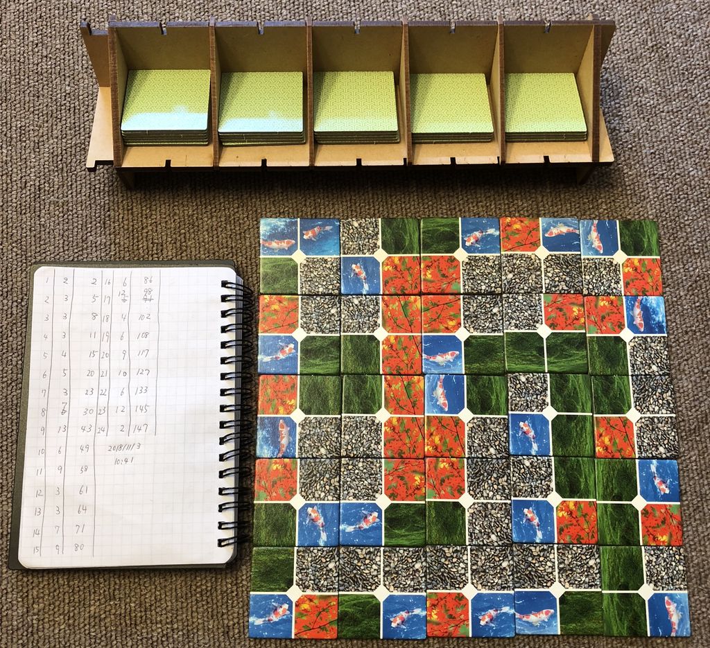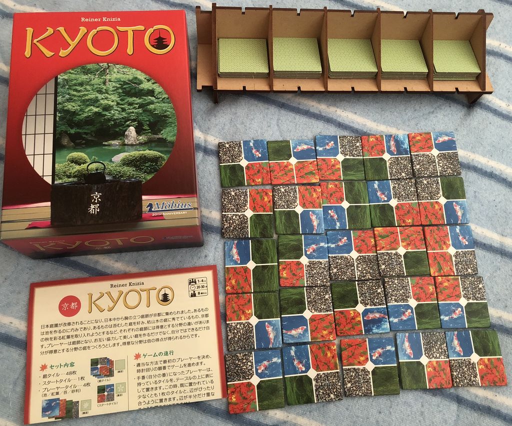 ライナー・クニツィア教授が、メビウス・ゲームズ20周年記念でデザインした、1枚のタイルに池、紅葉、苔、砂利の4種類の絵が描かれていて、それを組み合わせることで得点を重ねていくゲームです。