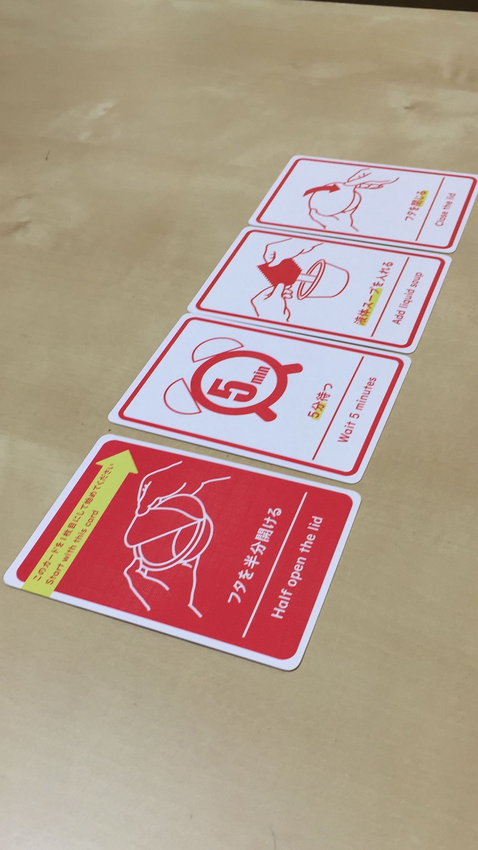 カードをよく混ぜて、一番上に「フタを半分開ける」のカードを置いたらスタートです。