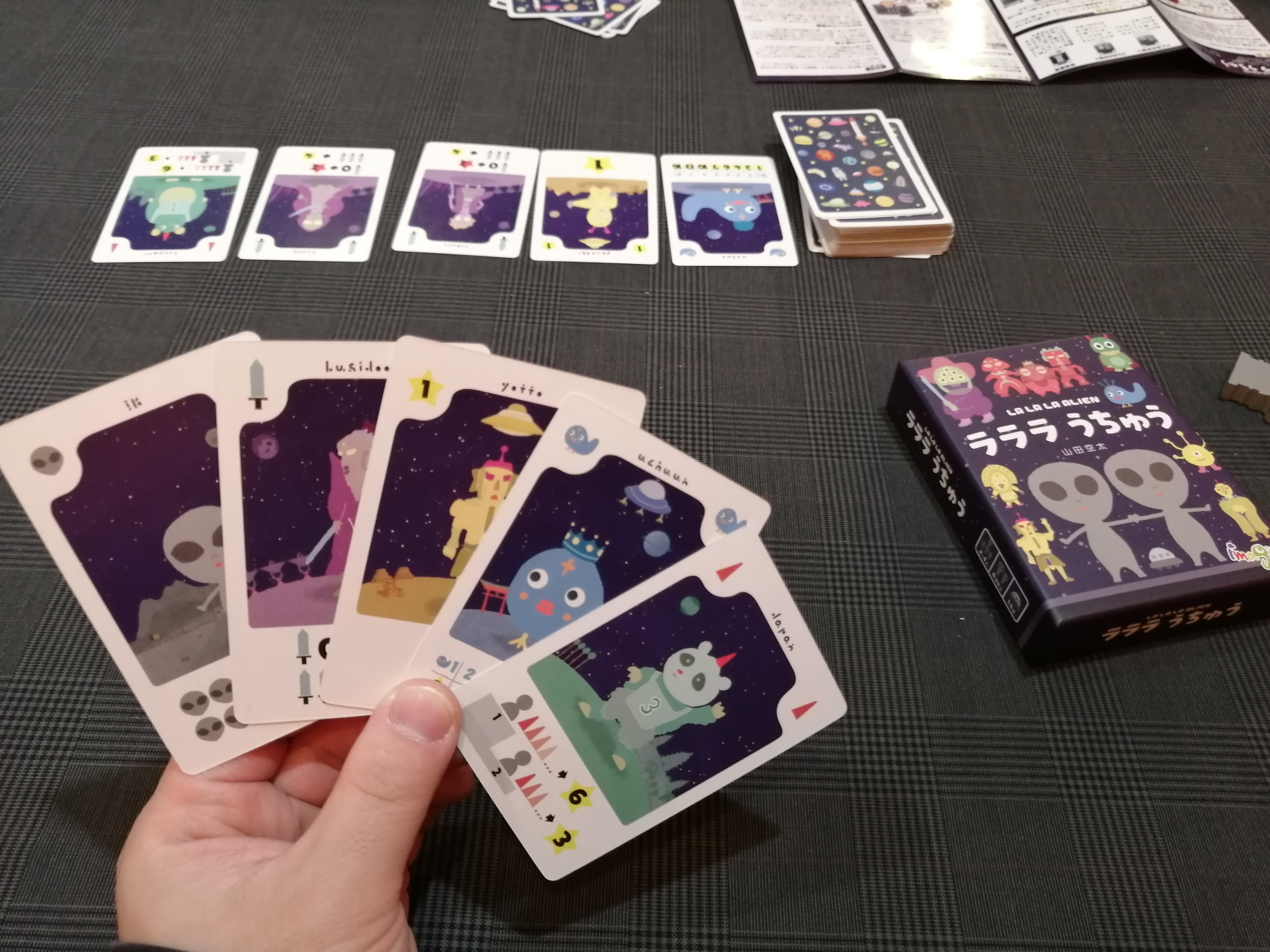 宇宙人を集めて種類に応じた得点をたくさん獲得しよう。宇宙人は8種類いて、種類ごとに得点方法は違います。何人で遊んでも1人6回の手番をしましたらゲームは終わりますが、今回は2人で遊びましたので配られる手札は5枚で場札も5枚です。3人以上は手札4枚、場札4枚です。