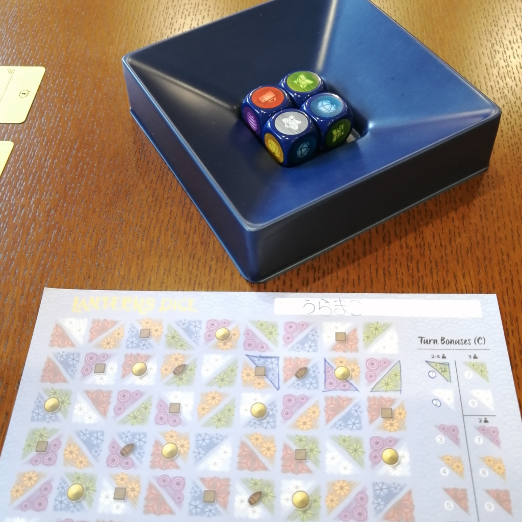 ダイス4個をトレイに投げ入れたら収まるようになっているので、自分が欲しい色のダイスを自分に向ける。他プレイヤーも向けられたダイスの色に対応する同じ色のランタンをチェックする。