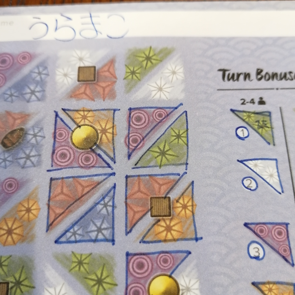 ゲーム終了時に、配置できた花火タイルの得点、個人シートにチェックしたランタンの繋がっている大きさで、2番目に大きいエリアのマス数の得点(四角にチェックできてないとダメです)、船を囲んでいるボーナスの合計が高いプレイヤーが勝ちになります。