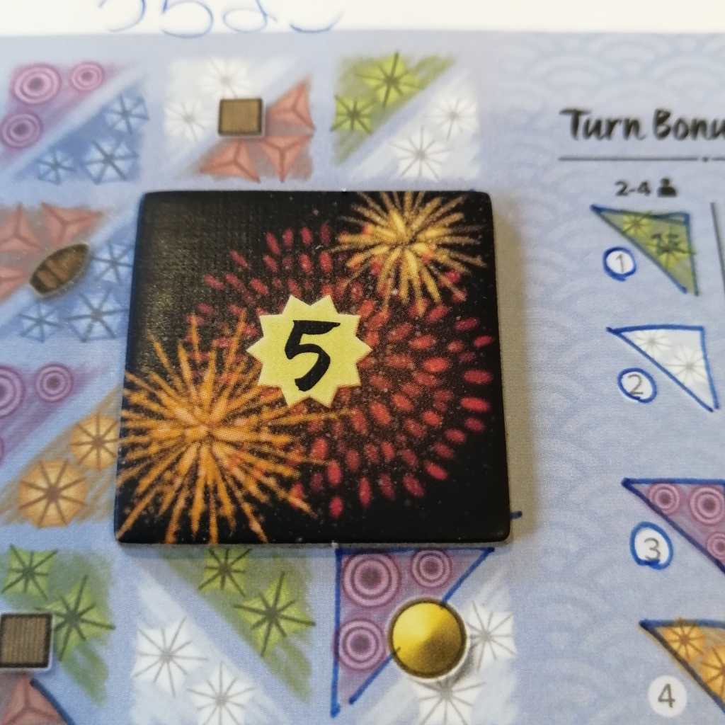 チェックしているうちにしっかりとチェックできていれば、ダイスを振った手番プレイヤーだけは、ラウンド終了時に花火タイルを配置してもよい。手番プレイヤーは、ラウンド開始時に指定された色のチェックボーナスがあり。