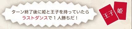 - 1~3 ターン目の各ターン終了時に、王子カードと姫カードの両方を持っているプレイヤーがいた場合、「ラストダンス」と宣言して王子カードと姫カードを公開することでそのプレイヤーが勝利となり、即座にゲームが終了となります。