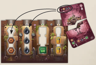 各エコメカニックは、下記のルールに従って、このフェーズ中に何度でもパーツを交換できます。交換は、自分の小屋にあるパーツと共通サプライの間でのみ実行されます。