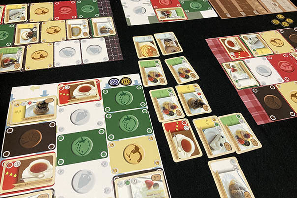 それぞれ異なるプレイヤーボードに、共通のカード置き場に表向きに公開されたケーキカードを順に取得し、ボードに配置。最終的な得点を競うゲーム。