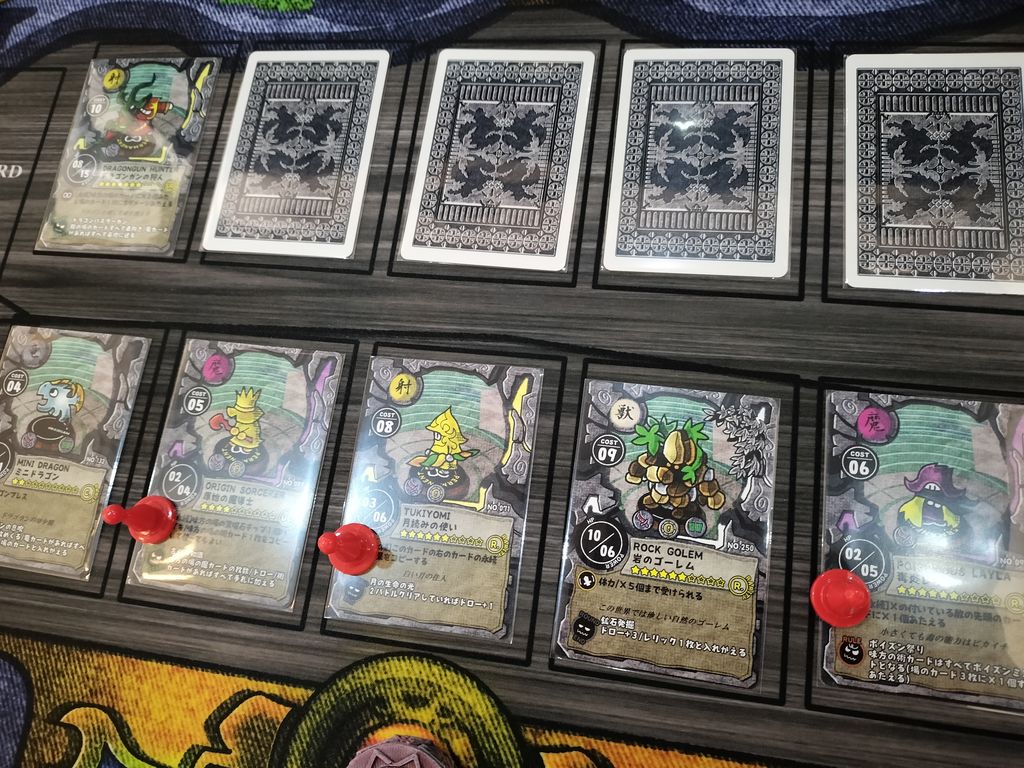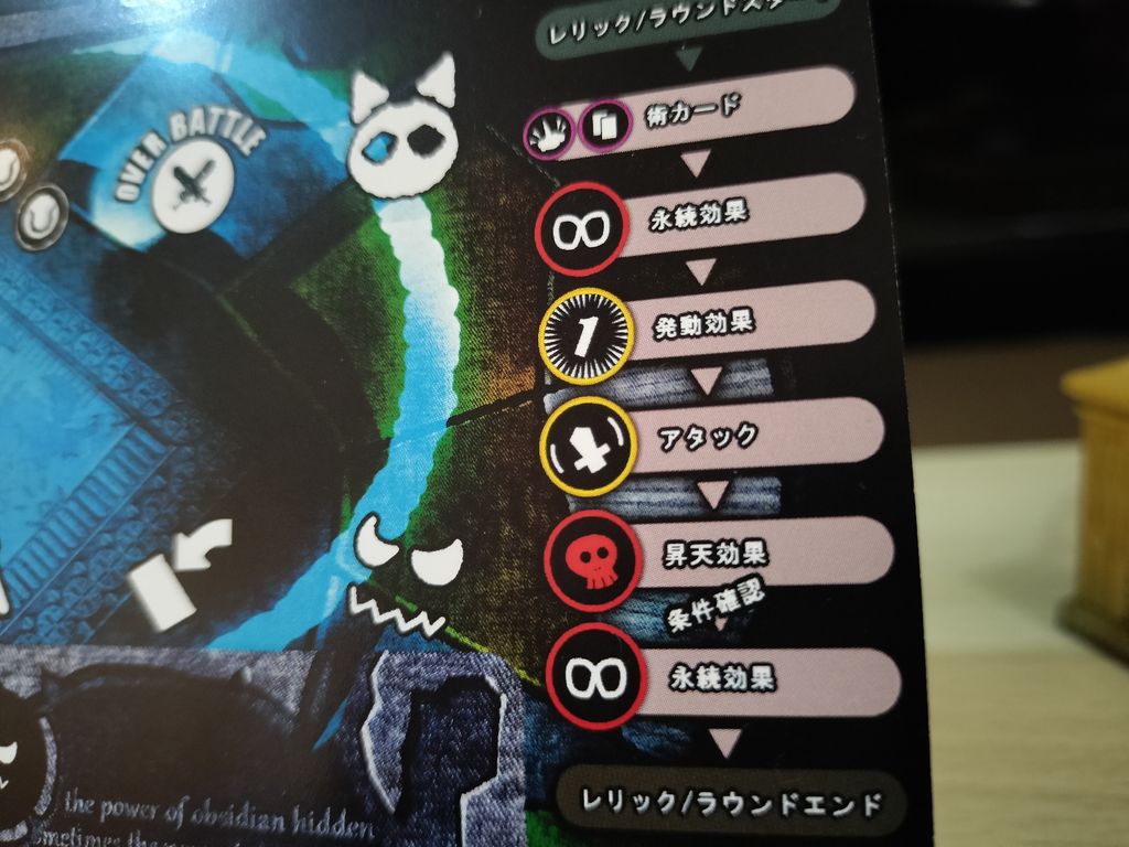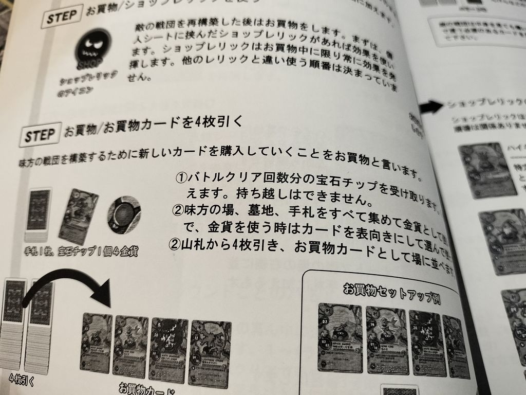 レリックはお買い物終了時に必ず手札から1枚選ぶ必要があり、何枚でも所持可能。もちろんたくさんあったほうが有利な展開になります。ちょっと微妙な効果のカードや、なかにはルールを大きく変更するレリック効果もあるため(例:すべての術カードが〇〇に変化など)、組み合わせによってはゲーム展開が大きく変わる場合もあります。ただ、これも運要素が大きく絡んでおり、なかなか理想のレリックを獲得できないのも面白い要素になっています。
