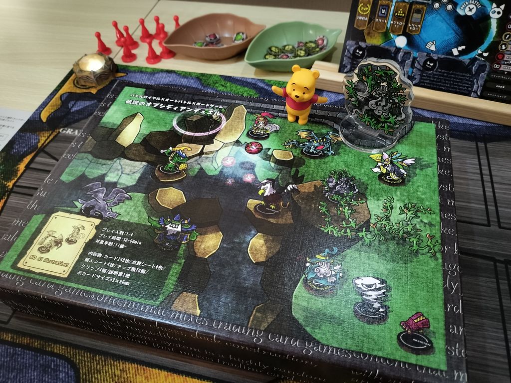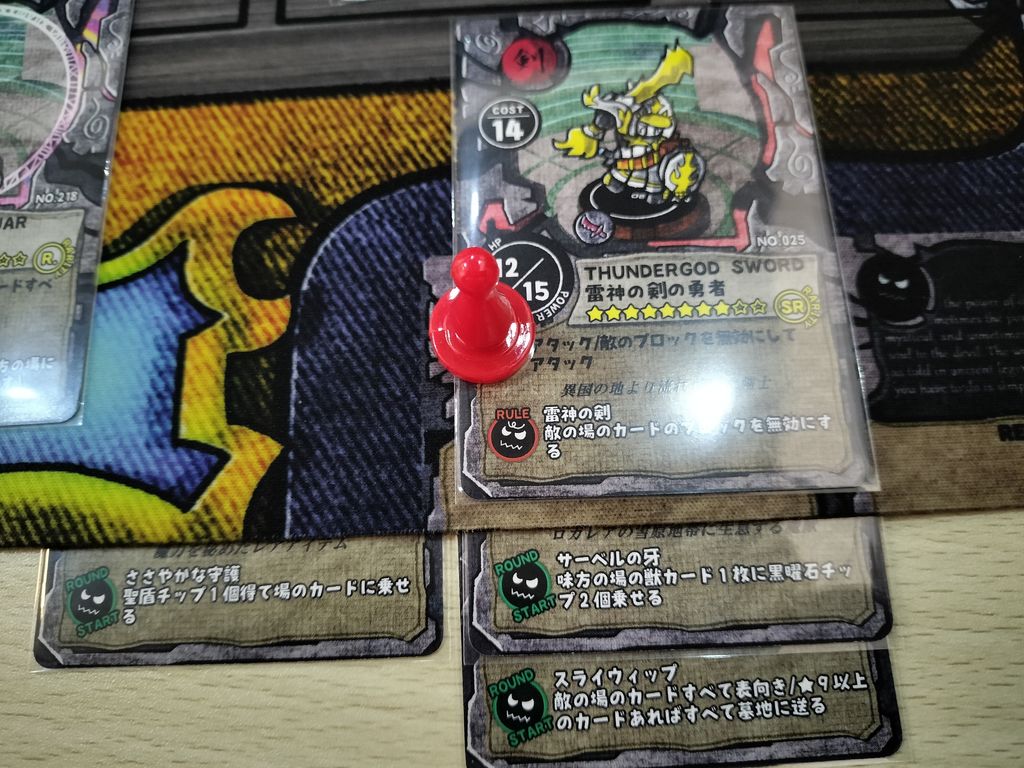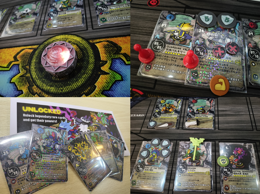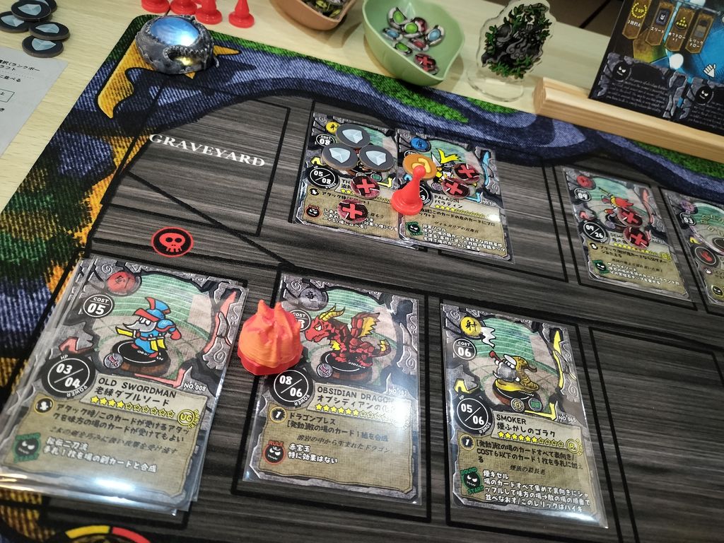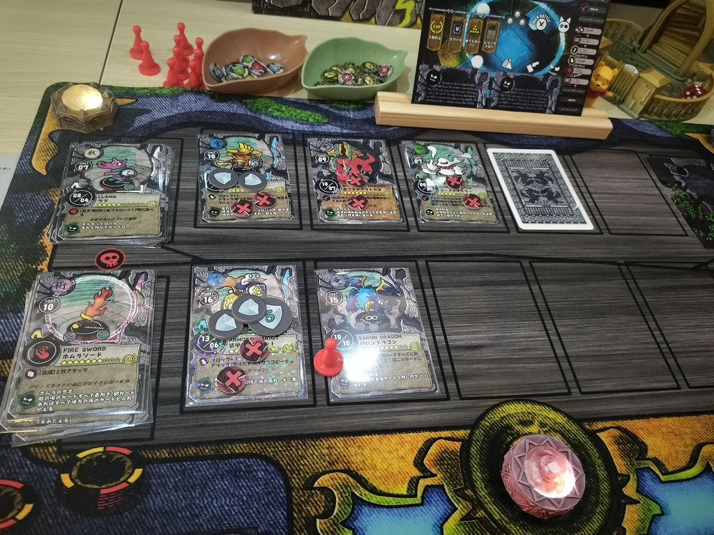 我が家では重量級ボドゲが多いため、こういったボドゲは非常に貴重でありがたいです。しかし内容はかなり充実しており、個人的には豪華な状況で楽しみたいため、KSで入手した専用プレイマットほか、別ゲームの各トークンやミニチュア、★9以上のレアカードにキラキラスリーブなど、リッチなスタイルで楽しんでいます。↓