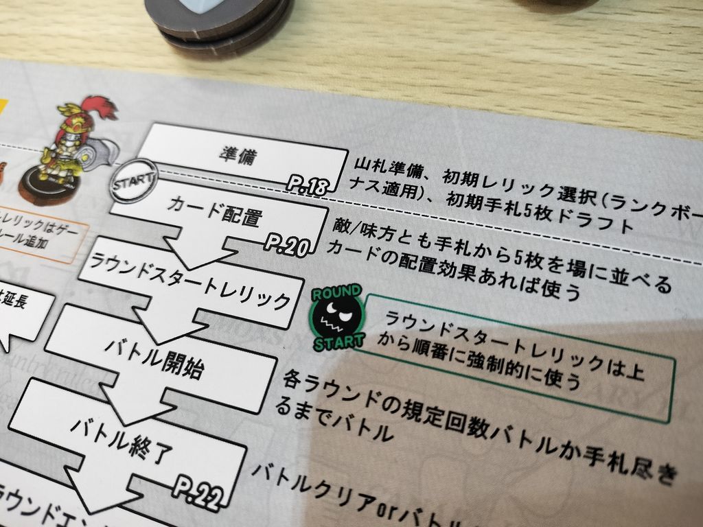各ラウンドごとに設定されたバトルはすべてオートシステムで、前述したタイムテーブル(①術カード→...⑥永続効果の確認・発動)を繰り返して自軍→敵軍で交互に処理していくため、一度バトルが始まればノンストップでバトル終了まで自動進行。もちろん処理はプレイヤーが行いますが、この自動バトルを客観的に眺めるのは、他のボードゲームやTCGにはない珍しさがあり、これはなかなか面白いですね。