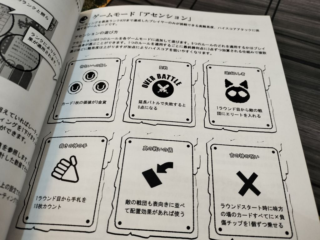 最高ランクに達すると、さらなる上級レベルのアセンションモードをプレイすることが可能。6つの異なる条件を自由に追加でき、難易度もさらに上昇しますが、条件ひとつごとに勝利ポイントも+3点追加されて高得点を狙いやすくなります。(1ラウンド目からエリートカード出現・敵戦団もすべて表向きで各カード効果発動など)