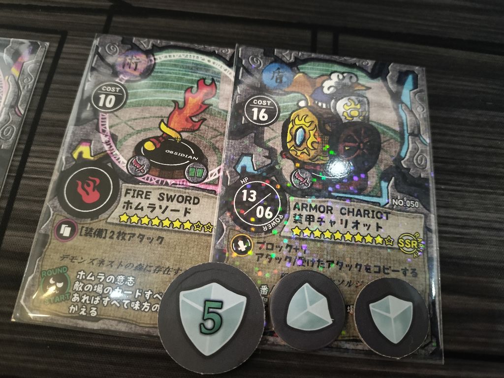 ・状態効果や永続効果などを表す専用トークンがあると良かった。個性あるイラストの黒曜石チップや聖盾チップなどはしっかり同梱されているため、これは非常に惜しいです...