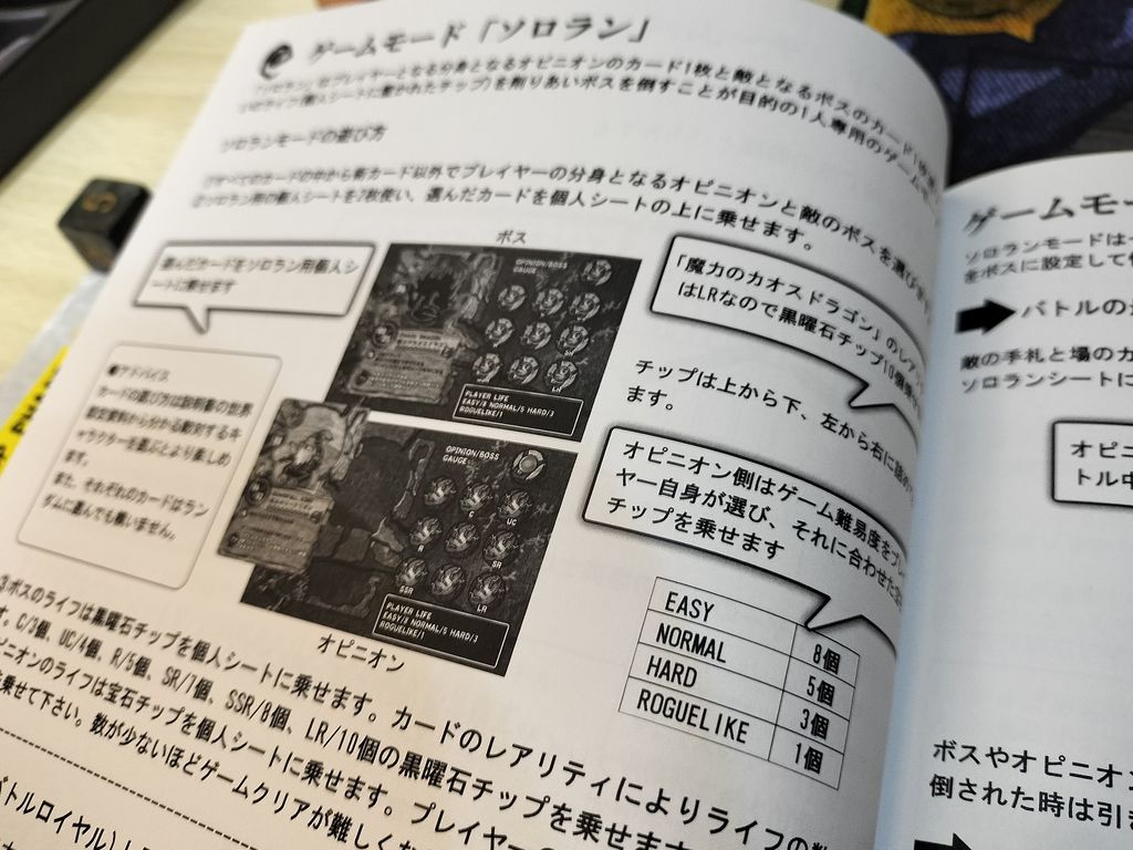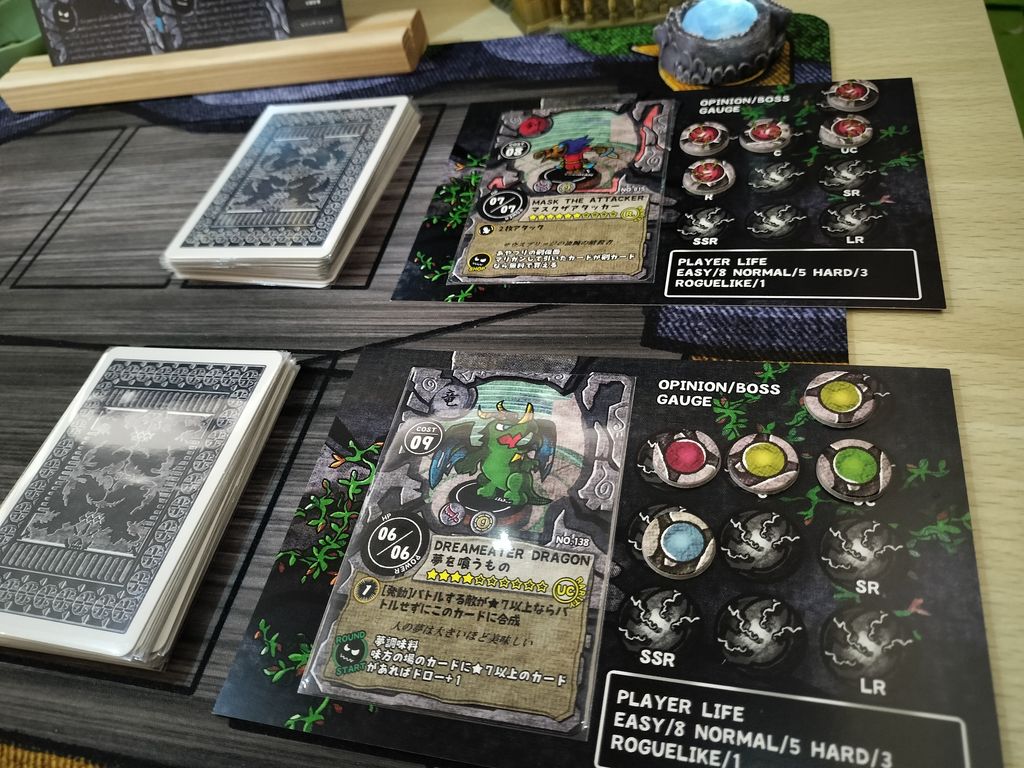 ソロプレイは通常のスコアアタックモードほか、ソロプレイ専用のソロランモードがあります。このモードはいわゆる「NPCとのタイマン勝負」。プレイヤーの分身であるオピニオンを1枚選び、専用の個人シートにセット。同時に、NPCの分身である敵のボス側にもカードをセットして準備完了。