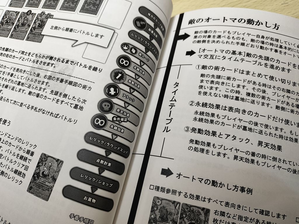 ・タイムテーブルの流れや2ラウンド目からのゲーム展開ほか、特に各カードの特殊効果やオートバトル時のNPC側の動きが慣れるまで戸惑いました。(このカードはこういった場面でどう使うのか?など)これは実際にプレイした多くの人が感じていたようです。