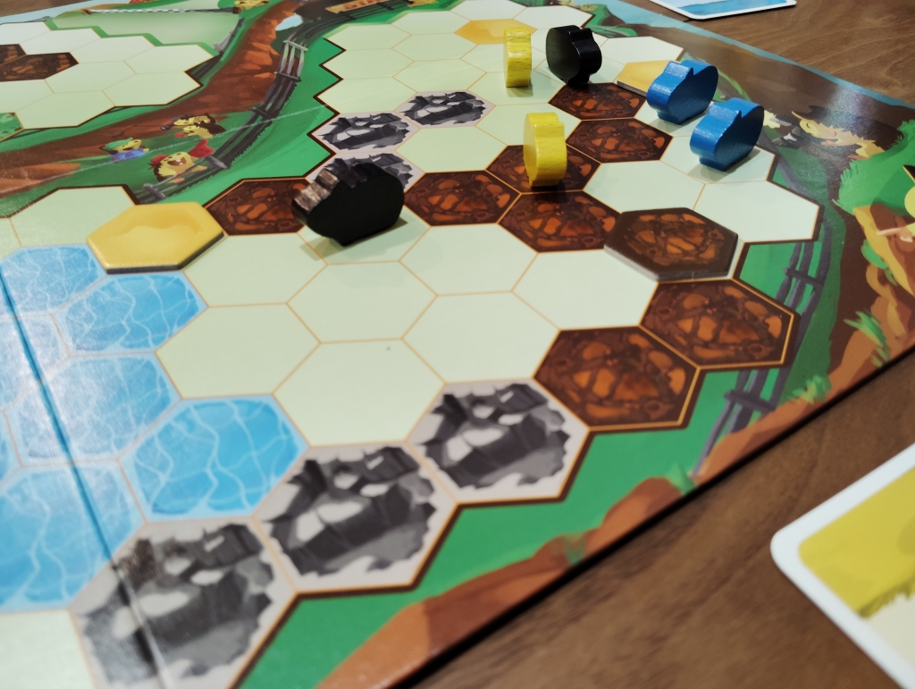 草原以外は、地形と同じ地形カードをプレイしないと移動できませんが、自分のコマや他プレイヤーのコマを進行方向に押したりすることができ、その際には押されたコマは地形関係なく進ませることができます。