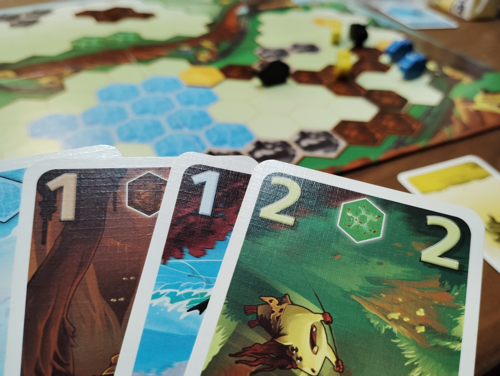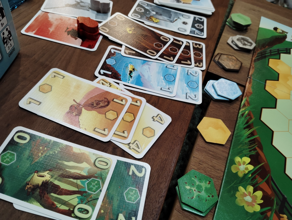 大きい数字をプレイしたら、小さい数字カードは更新されますが移動できるのと、その地形カードと同じ種類の地形タイルを1枚獲得して、コース上の好きなマスに配置して地形を変化させられます。