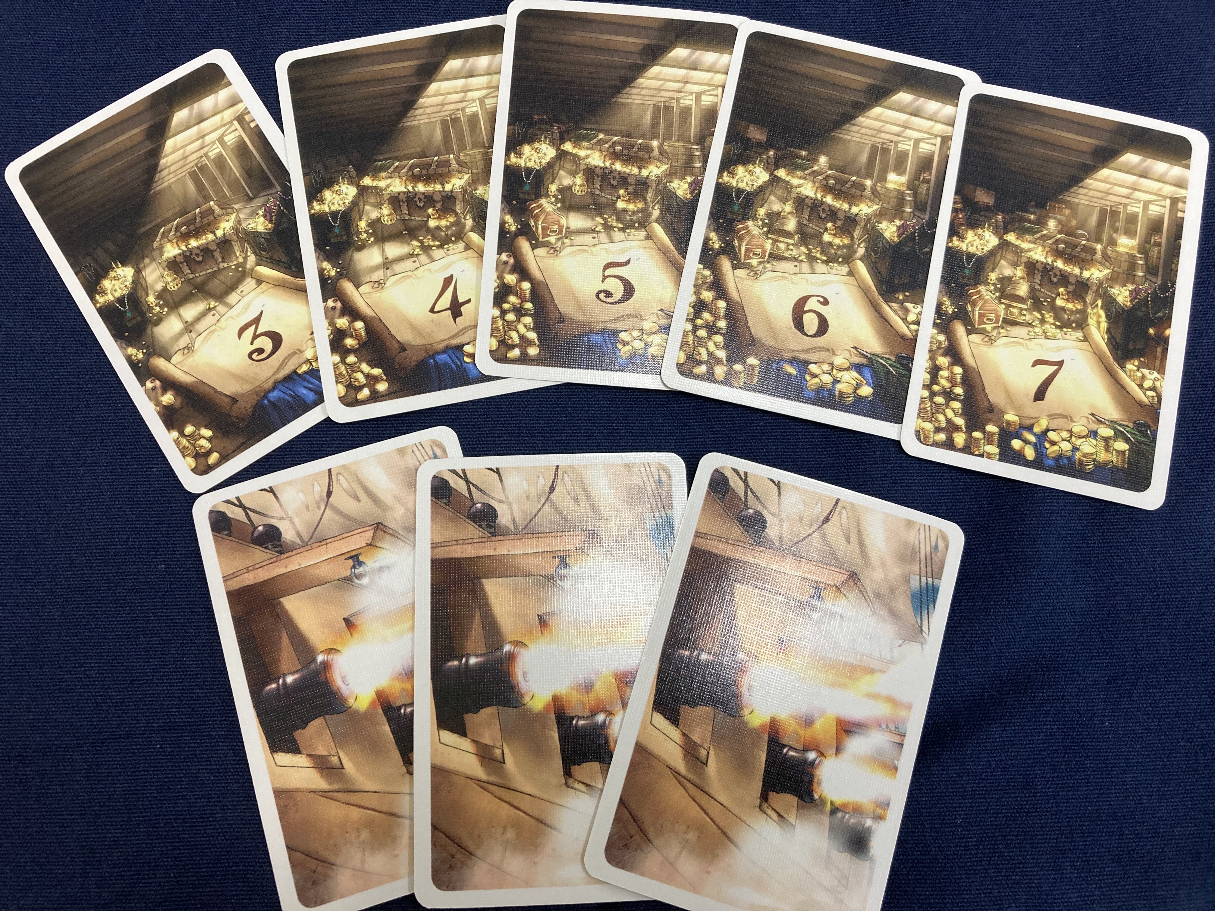 6人まで対応しており、各陣営ごとに積み荷となる《財宝カード》が5枚(3~7まで価値の異なる数字が書いてあり、これが基本的な勝利点になります。)と、私掠船の攻撃を表す《砲撃カード》が3枚(計3回だけ他国の船を襲撃できることを表します。)持ちます。
