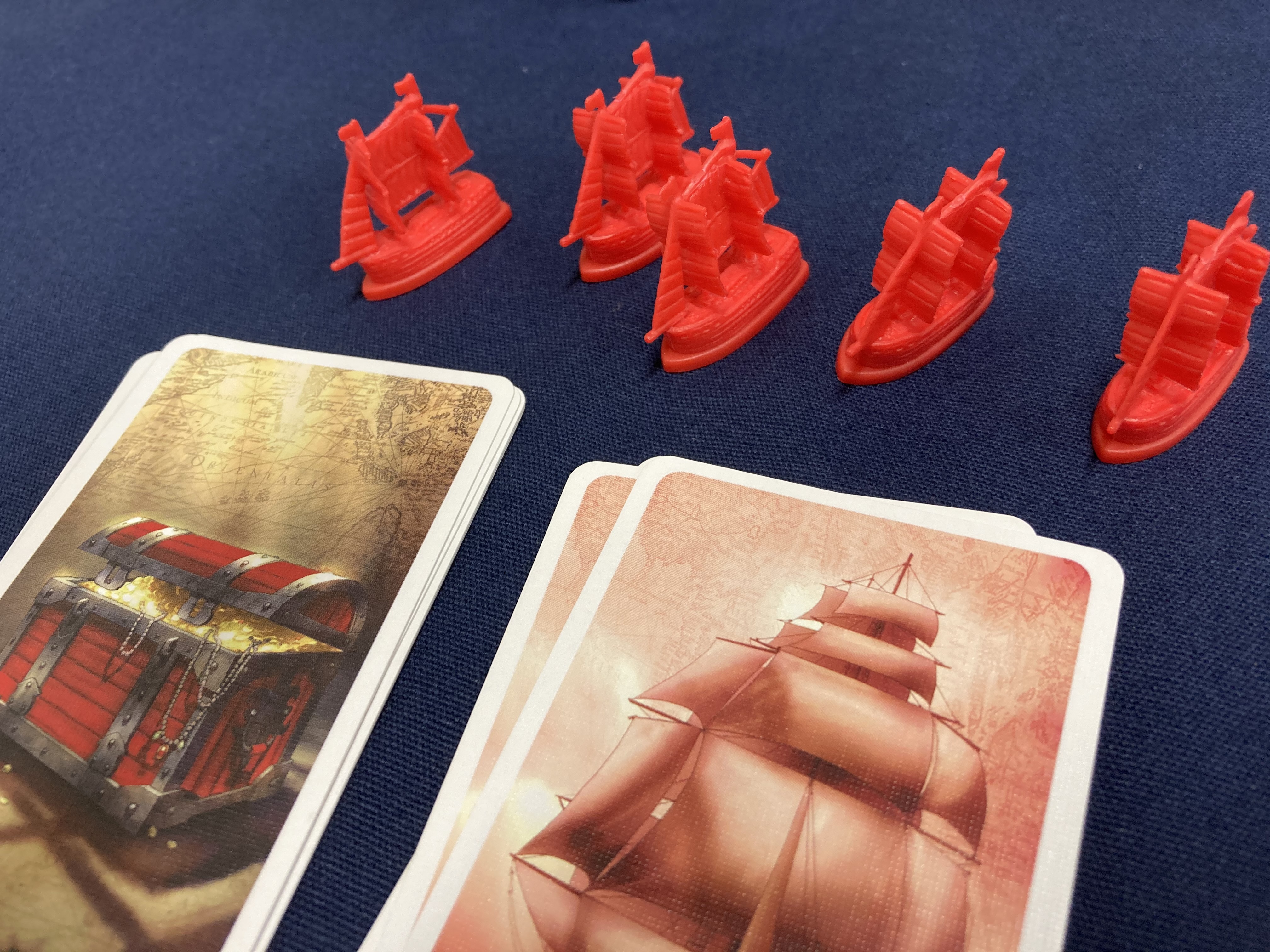 各プレイヤーはそれぞれ別の国家となり、他国の商船と積まれている財宝を見て、襲撃するかどうかを判断するゲームとなっています。