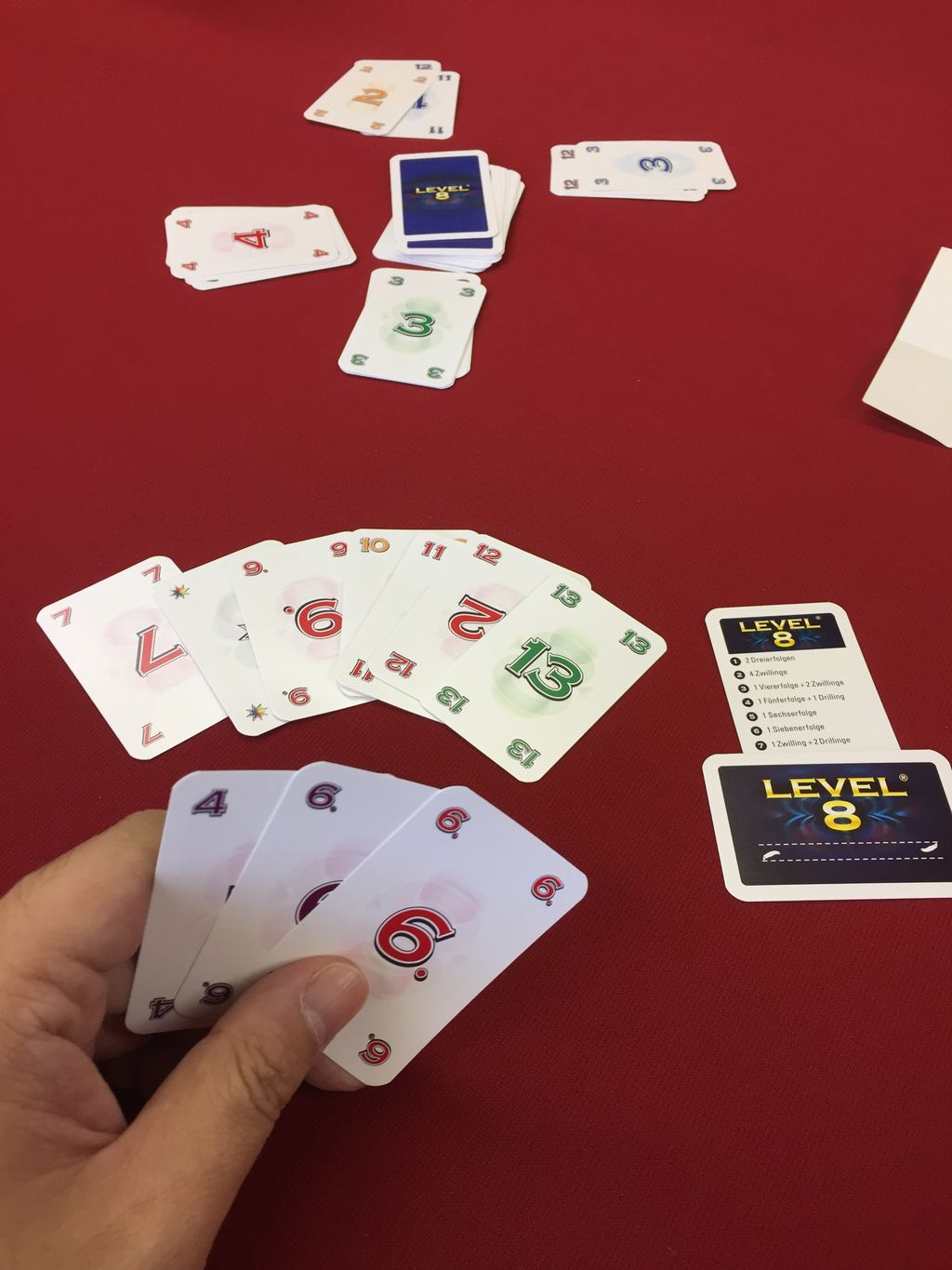 各プレイヤーにはレベルカードが配られて、1~8までの数字と共に、作るべきセットが書かれています。例えば、3連続の数字2セット、とかです。