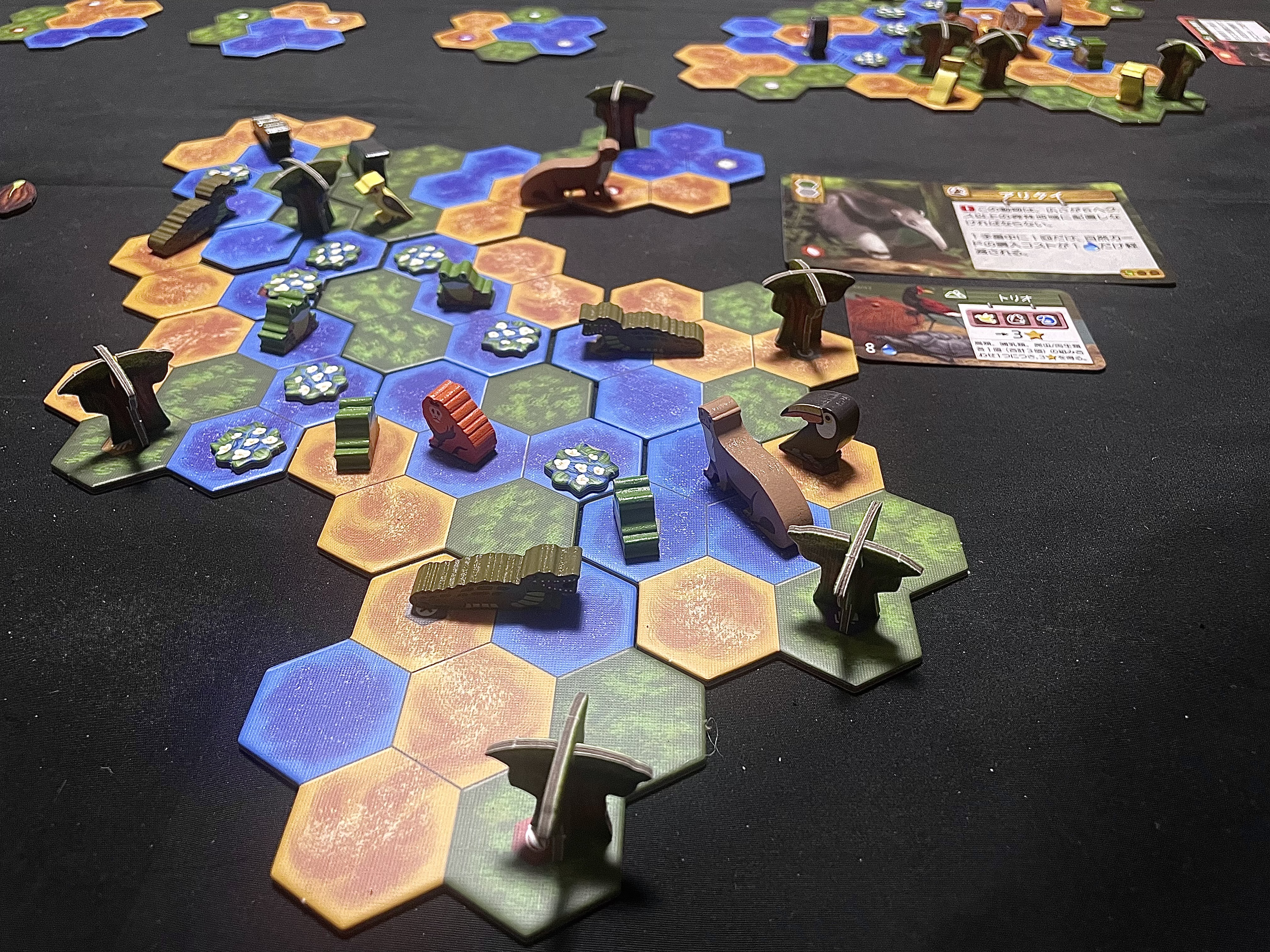 アマゾンを舞台にしたバックビルディング&箱庭ゲーム!気なっていた作品ですが、持ち込みいただき4人でプレイした感想をピンポイントにまとめると次のとおりです。