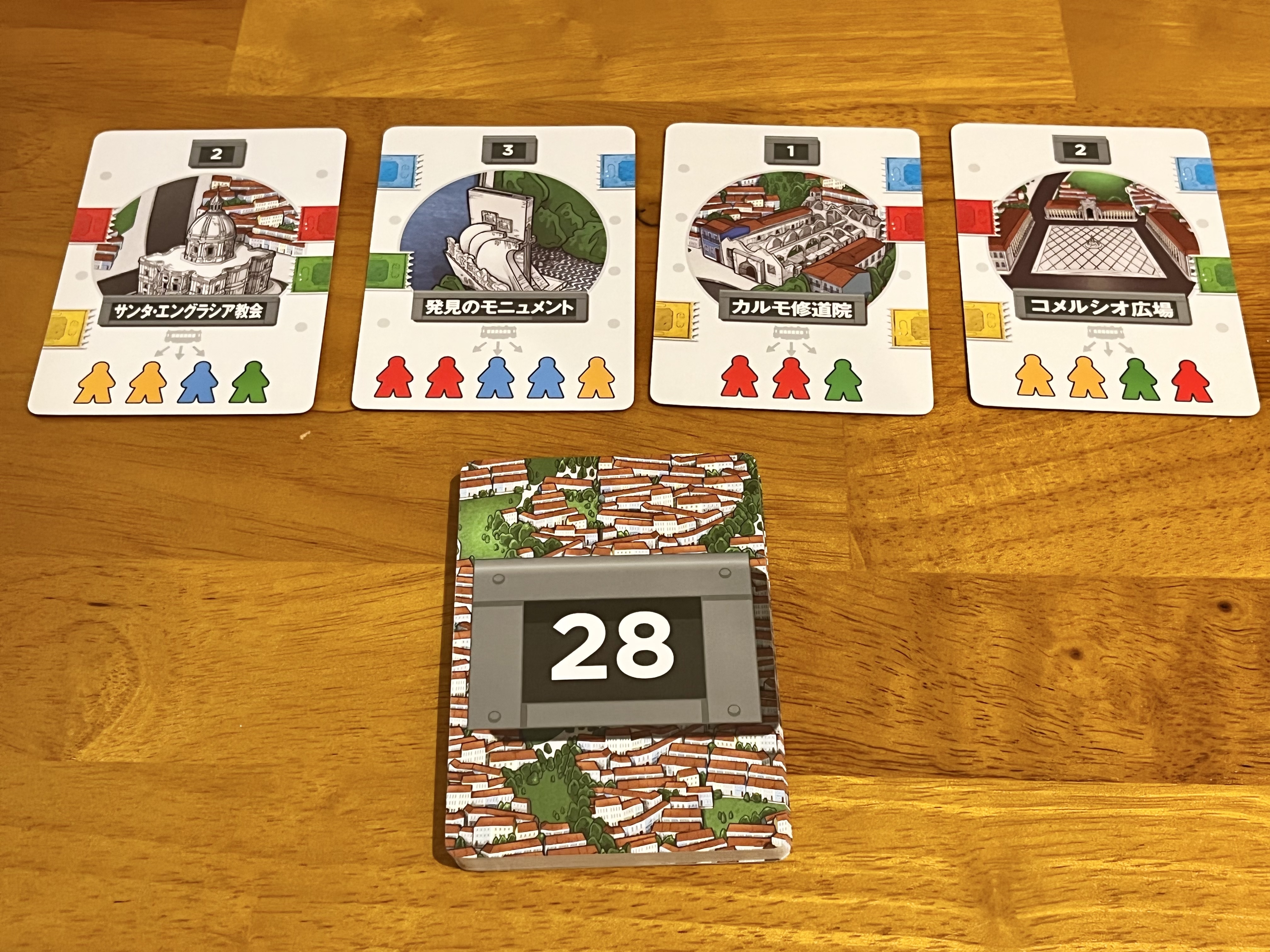 そしてようやく乗客を目的地に降ろしても、得られる目的地カードには左右に四色のタグが付いており、次の目的地カードとタグの色が繋がるよう左右どちらかに上手く配置しなければ効率のいい得点とはなりません。