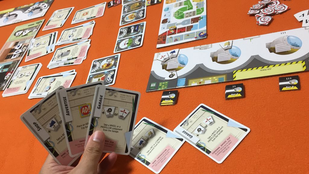 手番では、場のカード(7種類)から1枚取り、場合によっては対応するパーツを取り、タイムマシンに付けます。1ラウンド目は1台、2ラウンド目は合計2台、3ラウンド目は合計3台使え、パーツは繰り越しされていきます。