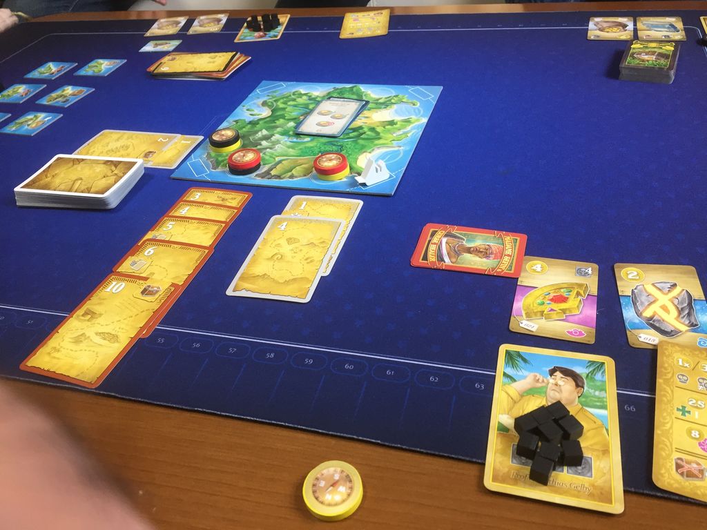 他に、決算場所を変えられる小島アクションがあったり、宝カードは基本的に「取ると呪いにかかる」ため、黒いキューブ(呪い)が集まっていき、ゲーム終了時に13個以上あったら脱落だとか、そのキューブを減らすアクションがあるとか、こまごまとしたところはあります。