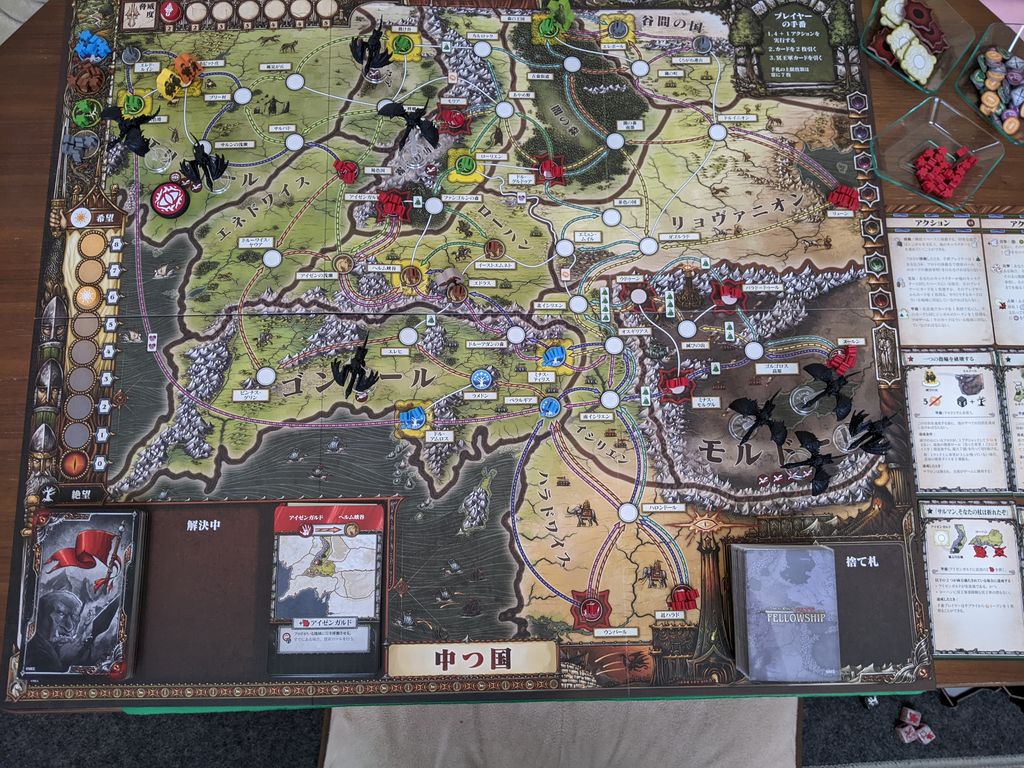 森の王国(安息地)が冥王軍に落とされた!初回プレイだが、中々難しい。従来の「パンデミック」シリーズより高難易度だと思う。プレイ時間も2人で初回2時間40分を要したので、重量級で人を選ぶかも知れない。尚、敗北を喫したのは言うまでもないw