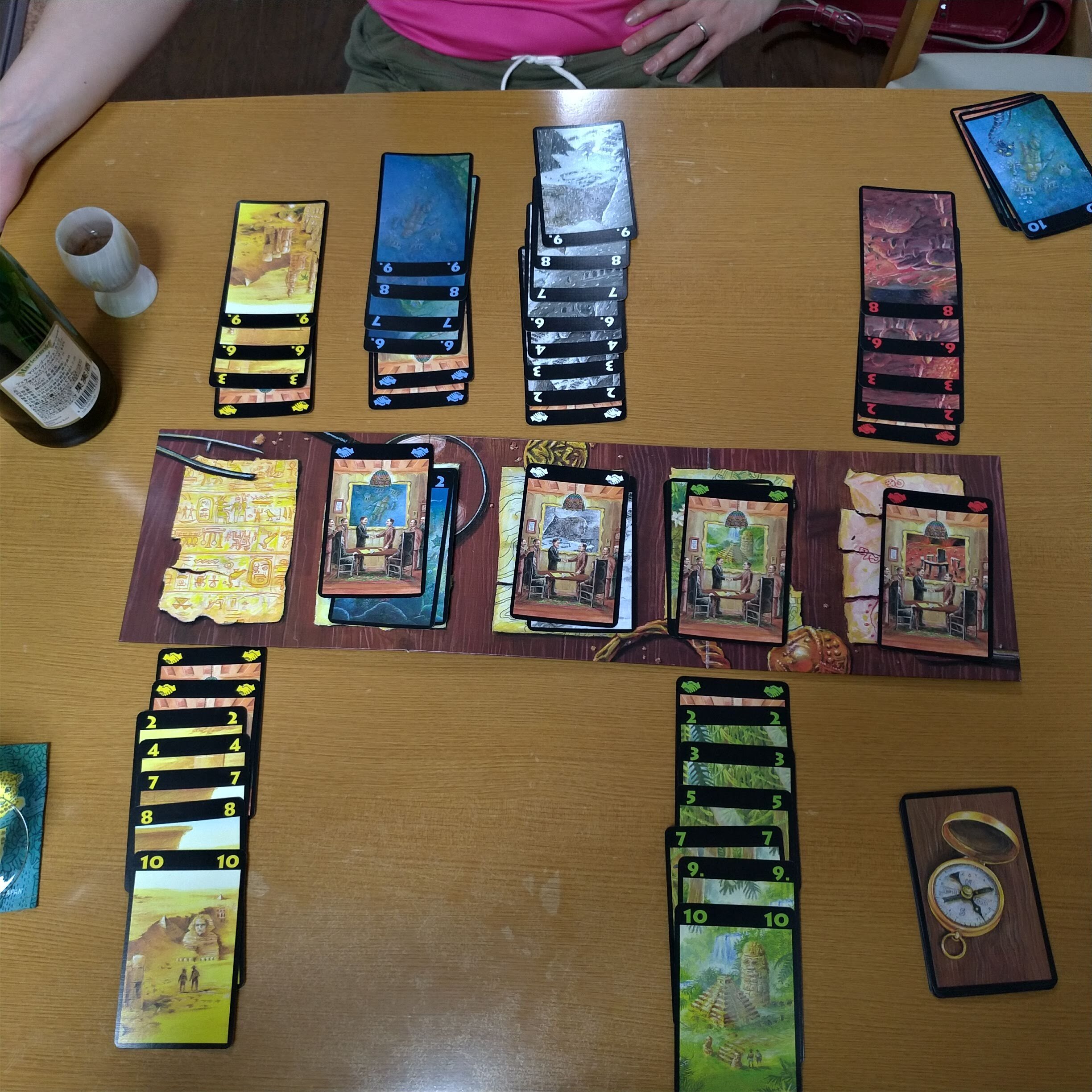 これだけなら、カードを数字順に並べていくだけのゲームになりますが、探検の準備あるいは探検に出発するとコストがかかります。そのため、5つの場で、1枚でもカードをプレイしていると「−20点」が名誉点から引かれます。つまり、同じ色のカードの数字を合計して20点を超えないと負けてしまうということです。