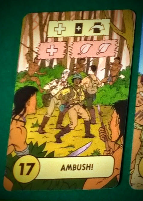 上記の写真の一番左の「AMBUSH!」の例でいうと、まず黄色枠を実行しなければならない。いずれかのキャラのライフを1支払い、ルートにカードを1枚追加して、次のルートカードを除去する。奇襲を受けて回り道をするイメージだろう。そして、赤枠のどちらかを実行しなければならないので、ダメージを1点受けるか、植物リソースを2つ支払うかを選べば、次のルートのカードに進行できる(次のカードは除去されているので実際には次の次)。こちらはケガを治療するか放置するかを選択するイメージだと思われる。