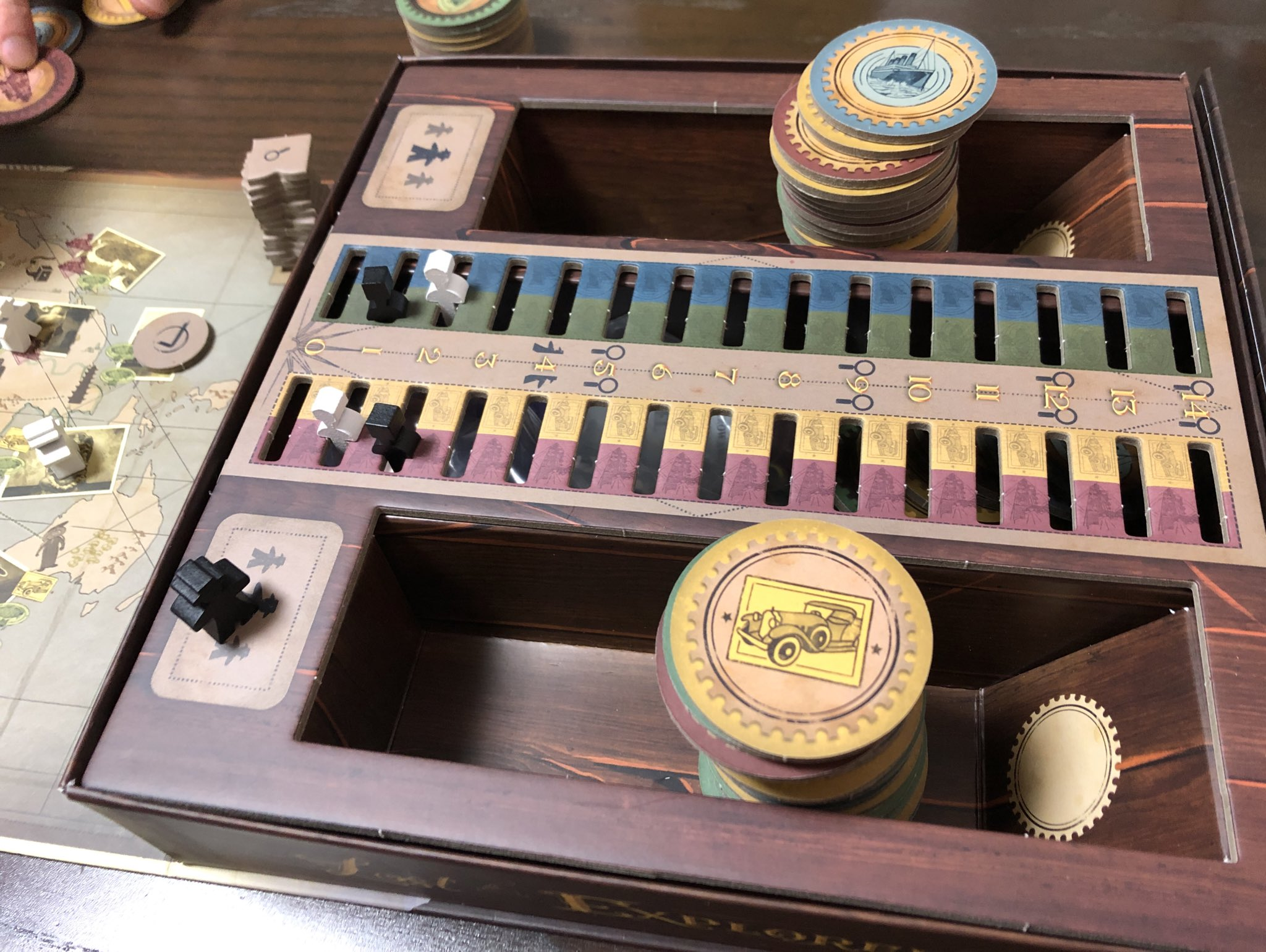 青か緑のエリアを達成したらボードの左側、黄か赤のエリアを達成したらボードの右側を進めていきます。両方4点まで来たら追加のミープル1個がもらえます。どちらかが5、9、12、14に達成すると虫眼鏡トークンが得られて、虫眼鏡を先に4つ集めたプレイヤーの勝ちです。