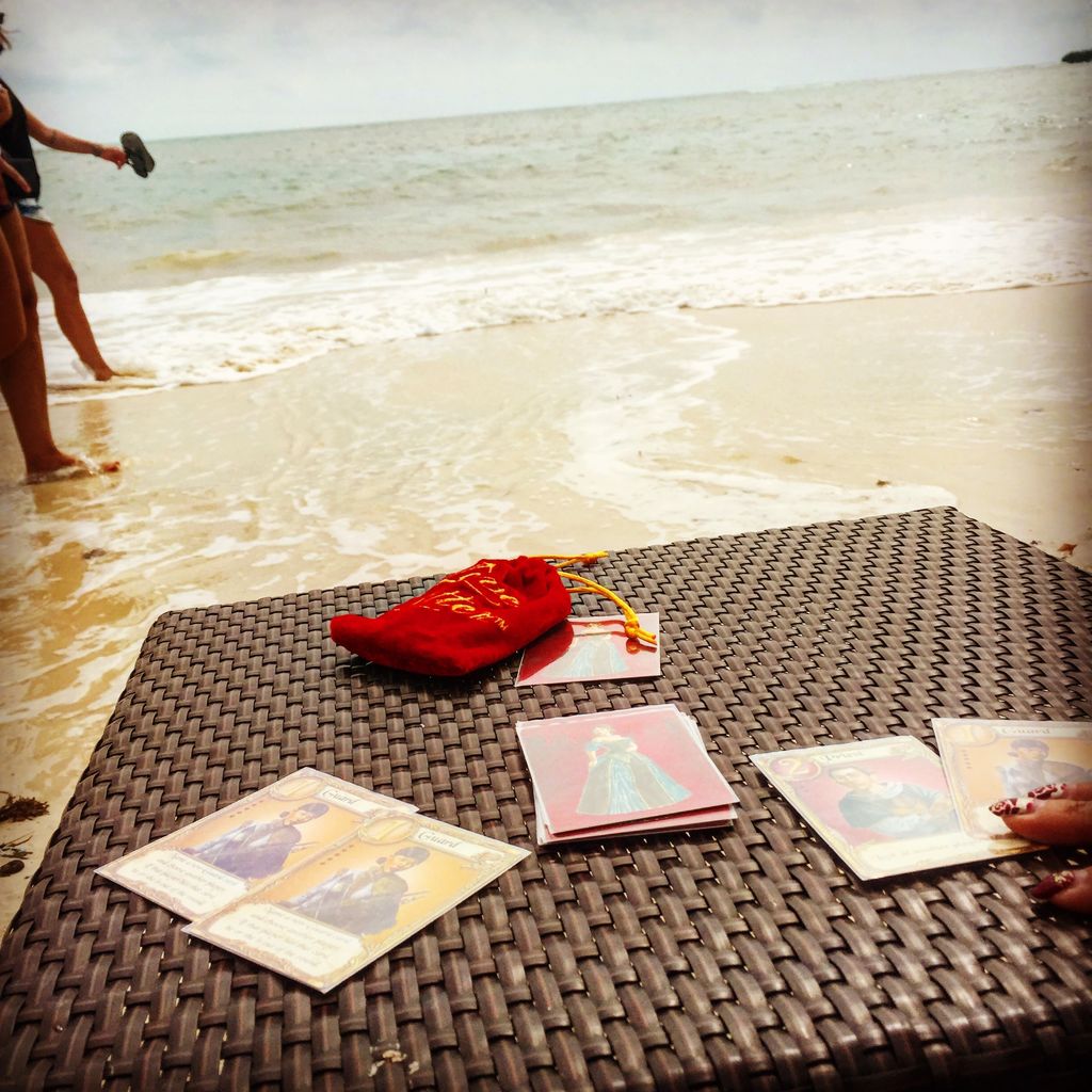 旅するボドゲ。AEG版は巾着に全てのコンポーネントが入るので持ち歩きに便利!ということで最近はどこ行くにもバックに入れて持ち歩いてます。今回はタイ王国のサムイ島のビーチでプレイ!