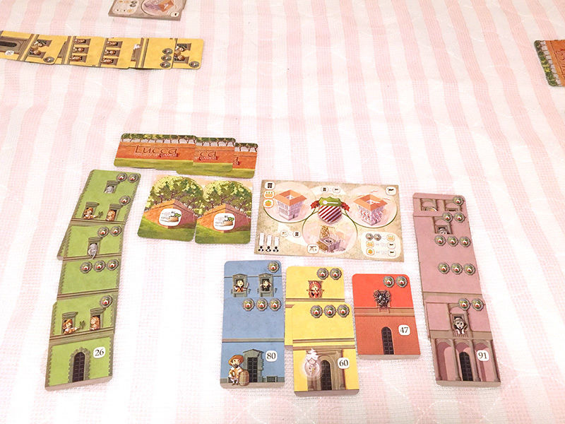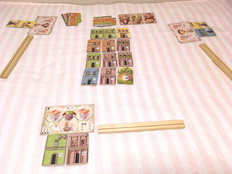 最終得点計算では、完成エリアにある市壁(トリプレットから取ったカードを裏向きにして置いたもの)と砦(砦カードがある)の枚数×公開エリアにある宮殿の数になる。