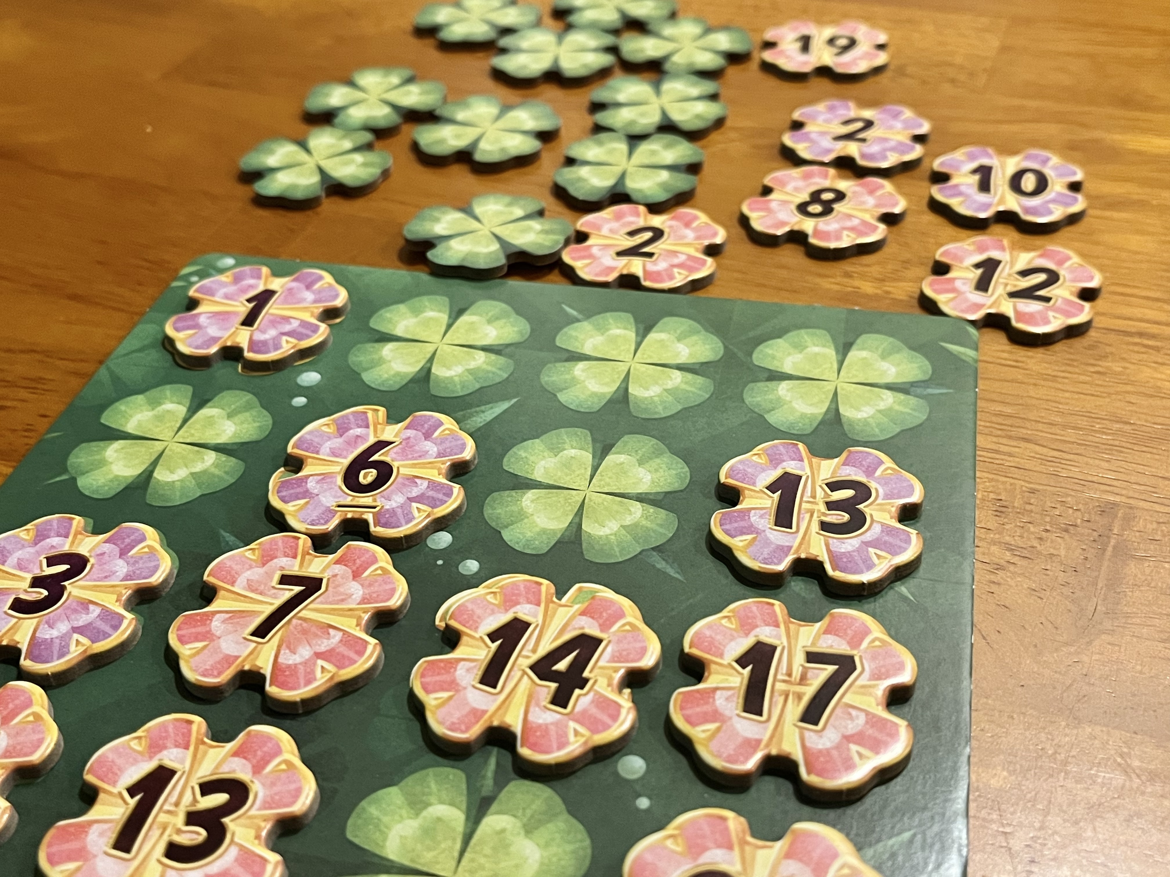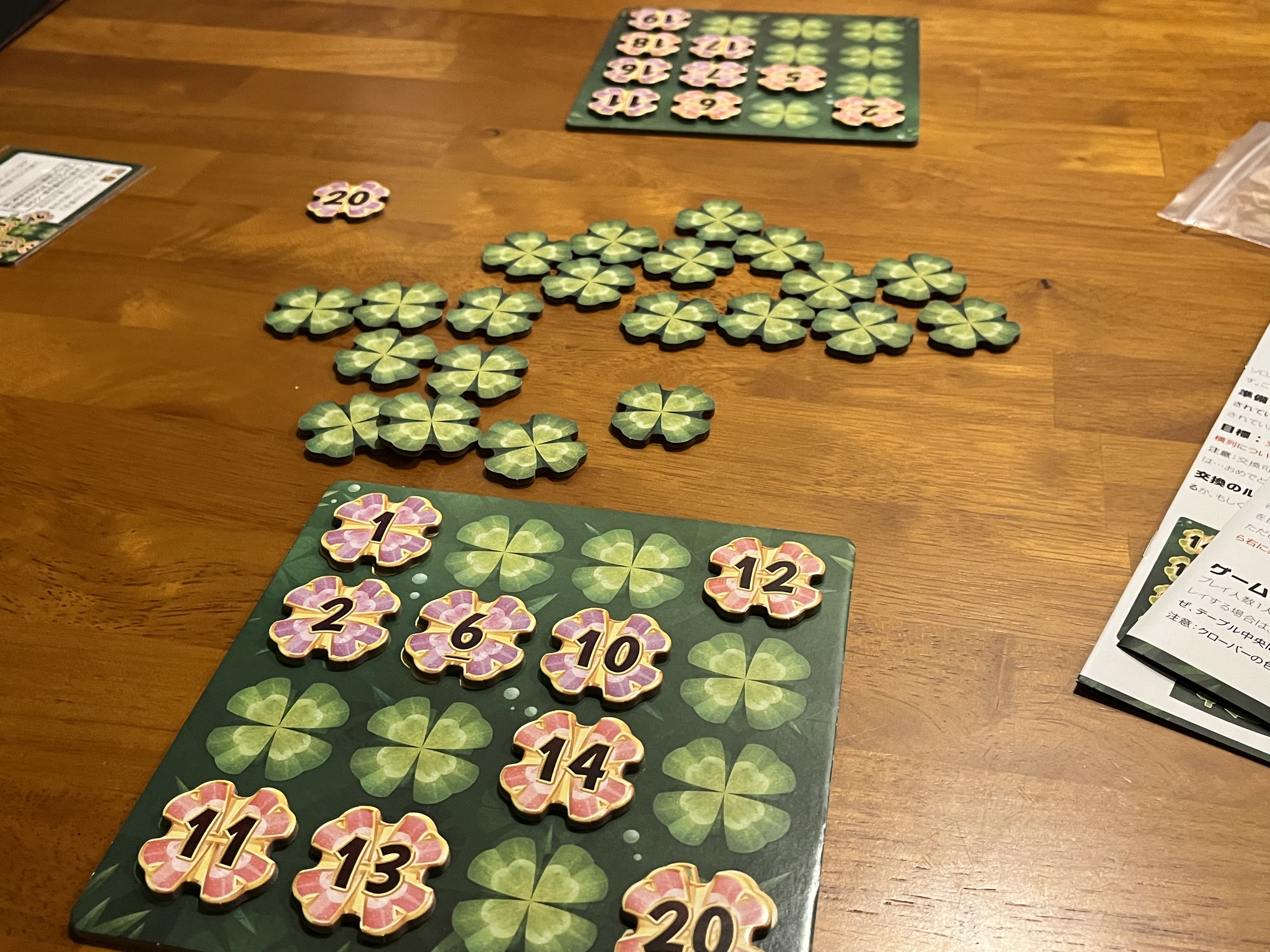 本作の基本ルールは本当にこれだけで、1〜20のクローバーのセットを人数分用意して、最初に埋めた人が即座に勝利します。