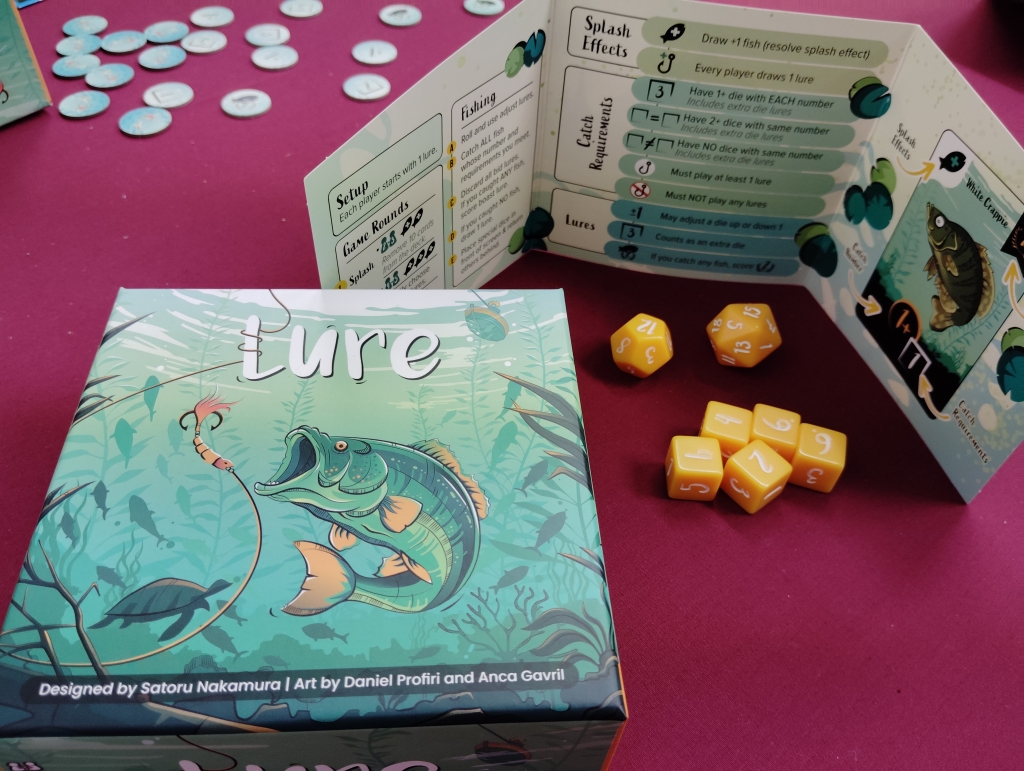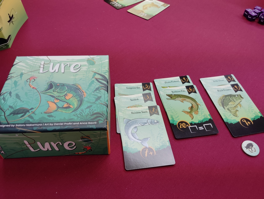 ダイ公望のリメイクで、たくさん魚をダイスで釣って得点が高いプレイヤーの勝ち。