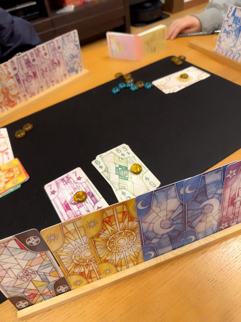 自分の手札の色はわかるけど、数字はわからない。相手がどう出してくるかを予想するのがとっても楽しいトリックテイキングです。ステンドグラスのカードデザインがとっても綺麗です。