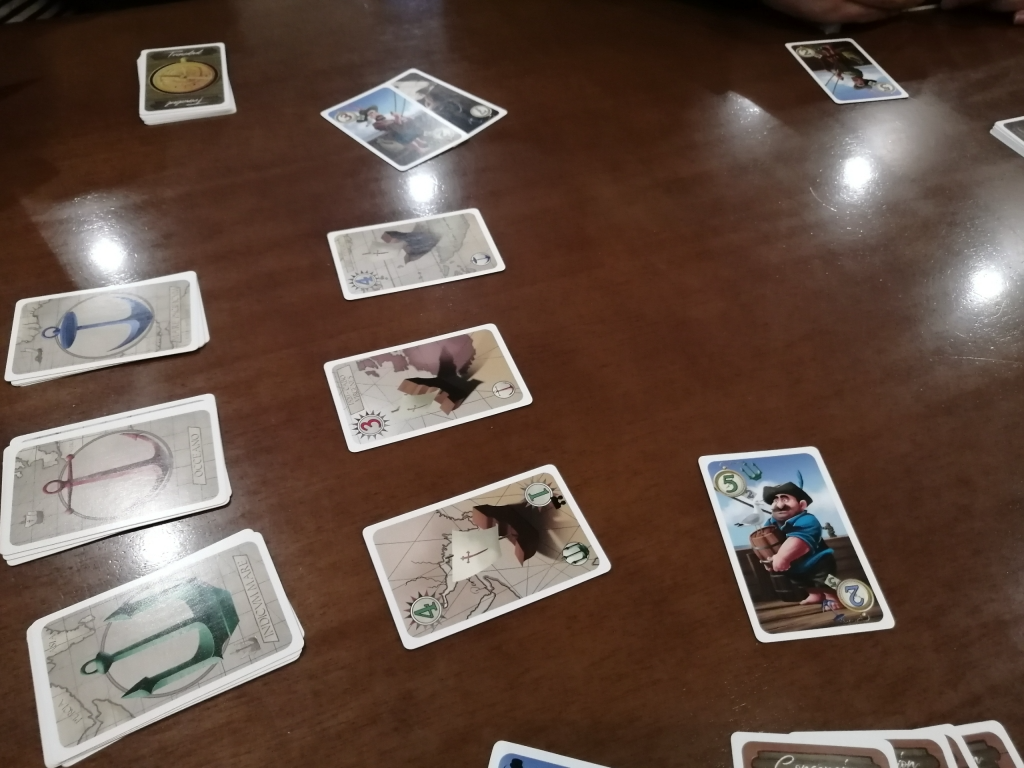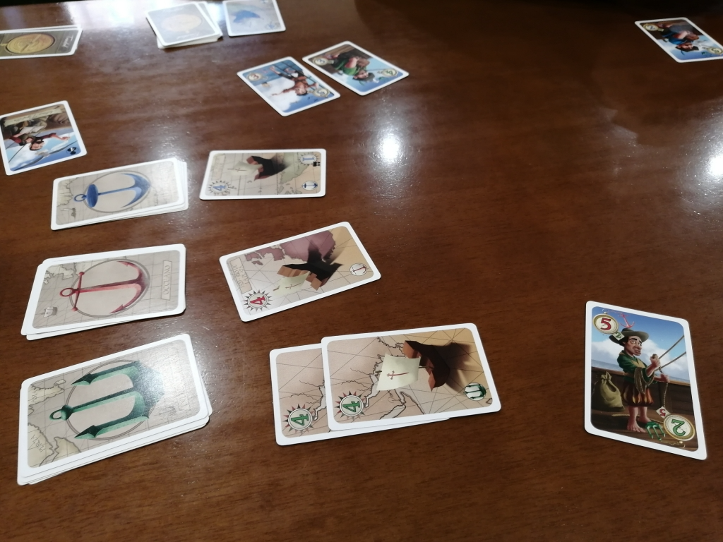 3人でプレイ。シャハトの競りゲームで、プレイヤー人数に関わらず6ラウンド終了時に落札した得点カードの合計得点が高いプレイヤーの勝ち。各プレイヤーは、同じ内容の船員カード15枚を受け取り、しっかりとシャフルして自分の山札にします。山札からカードを5枚を引いて初期手札にします。