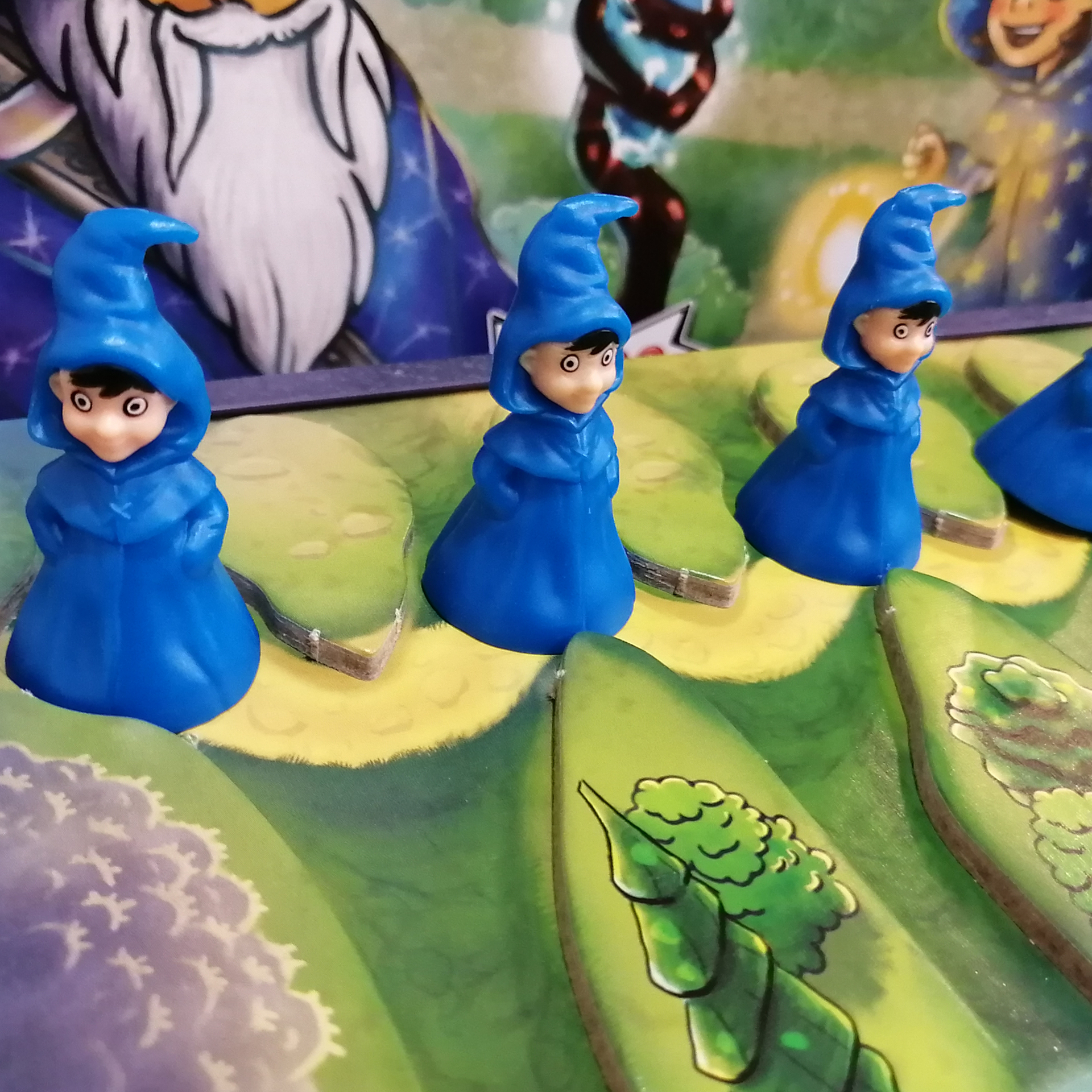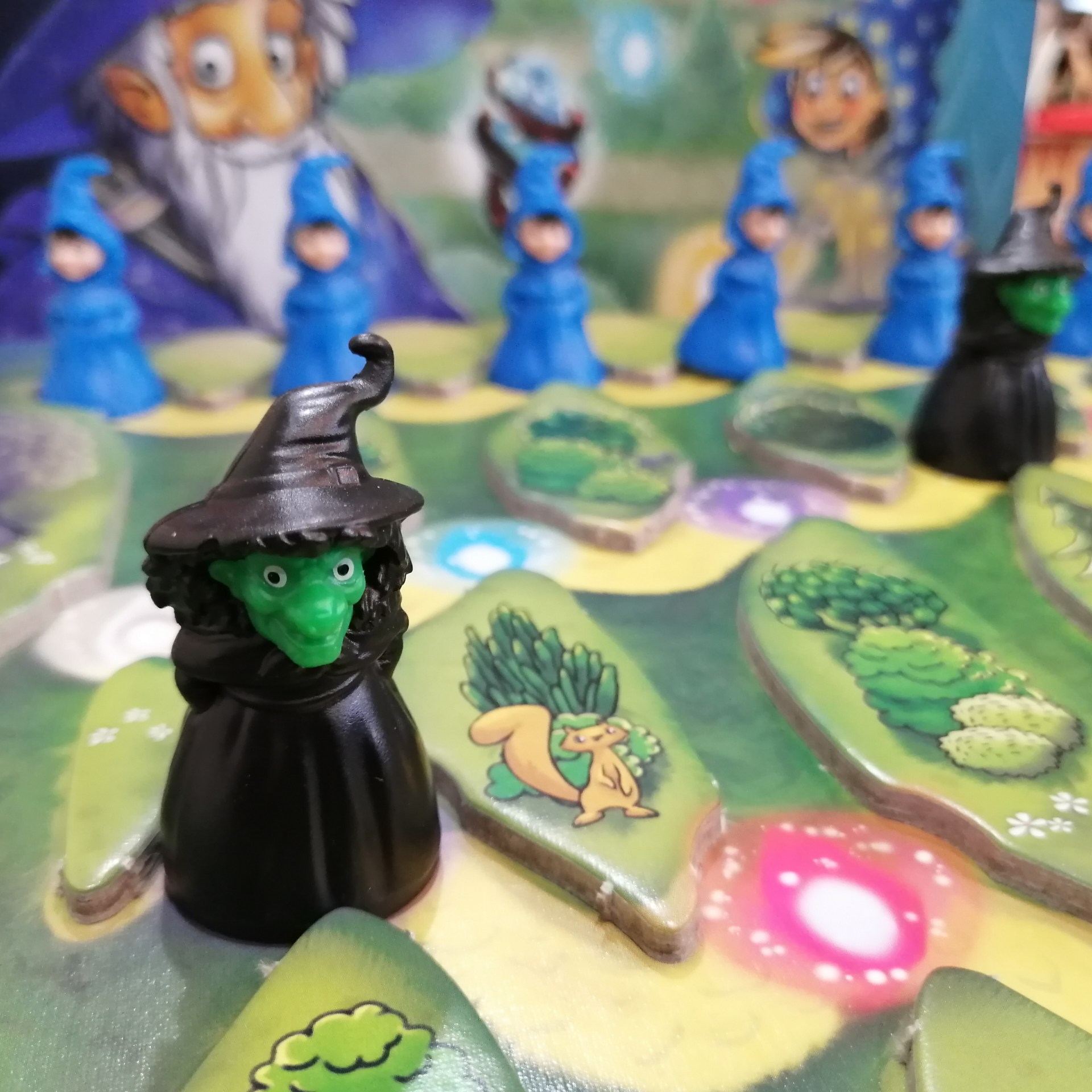 偉大な先生の下に魔女が3人辿り着くまでに生徒4人が辿り着けば勝ちな協力ゲーム。袋から取り出した玉を転がし生徒や魔女に当たれば、同じ色のマスまで進めて連鎖あり。