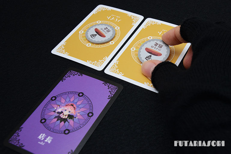 - 店長のみ場にあるバイトカードを1枚ずつ確認し、勝敗チップを上に乗せる。