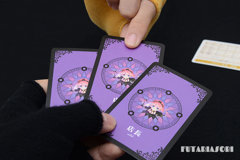 (2人以上で遊ぶ場合、バイト側はバイトカードをよく混ぜ、なるべく均等に配る。) - 店長側は、店長カードの左側に☆マークのついている上級魔法カードを3枚裏向きにし、よく混ぜる。