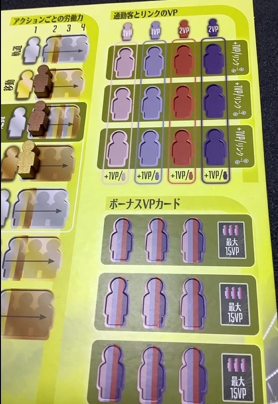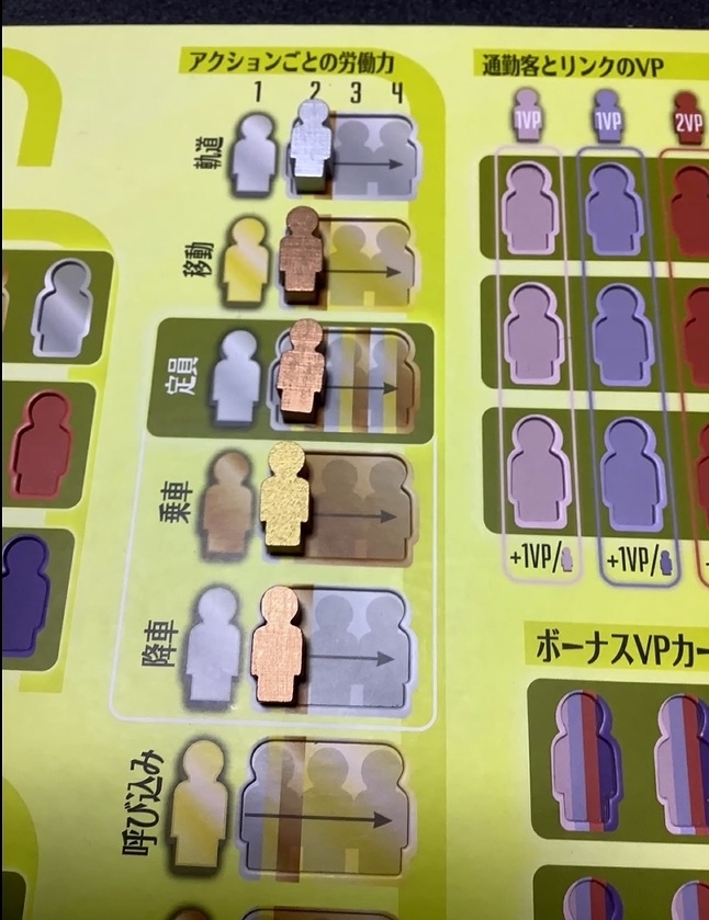とはいえ、このゲームの根幹は真ん中の労力を中心に左側の能力を埋めつつ、終盤は右側の勝利点を稼ぐように収束していきます。
