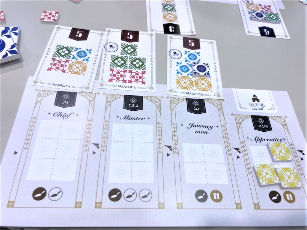 4つのエリアがあって、たとえば一番左のエリアは、3枚3枚で異なるタイルを置くとクリア。達成すると、エリアの下にコテみたいなのが書いてあるとおり、2種類のタイルを1枚ずつ、上の達成カードの上に乗せることができます。