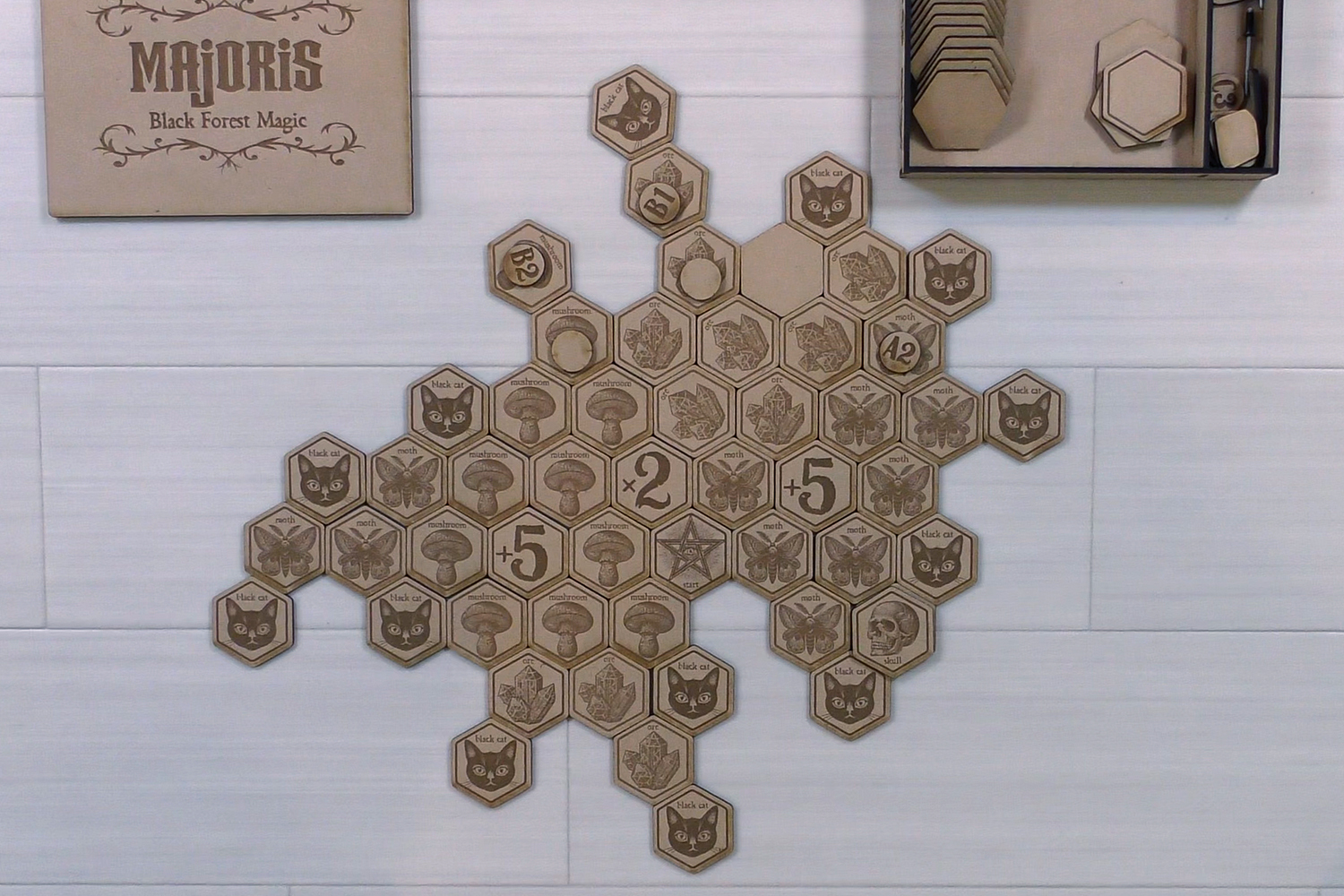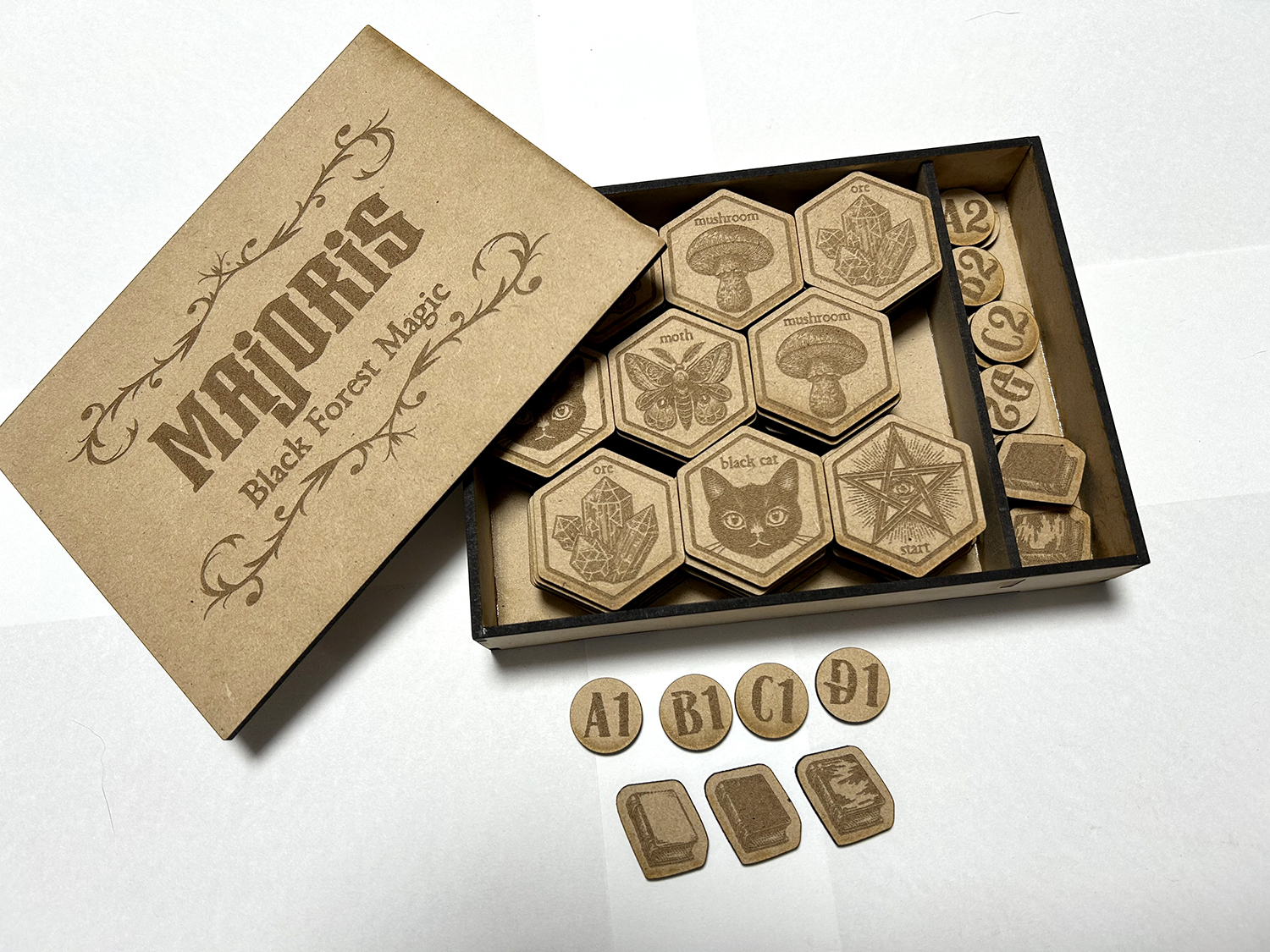 【マジョリス:黒い森の魔法】は、1〜4人まで遊べる、タイル配置のマジョリティ争いゲームです。