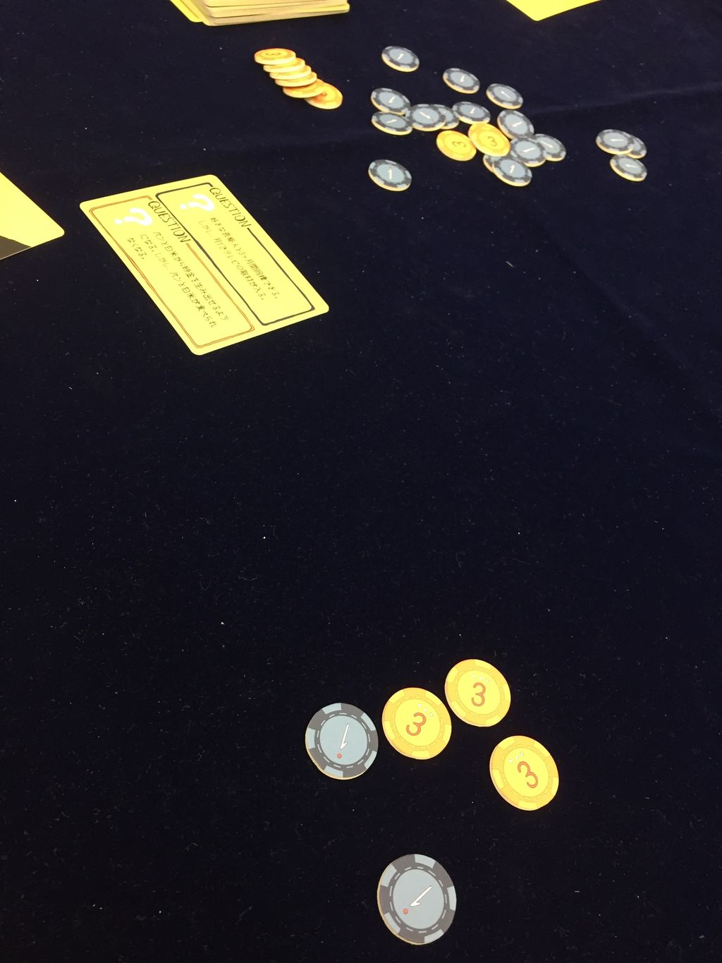 で、全員カードを一斉に出して、多い方に投票したプレイヤーが1点を得ます。親も出して、少数を出したプレイヤーから追加で1点を得ます。