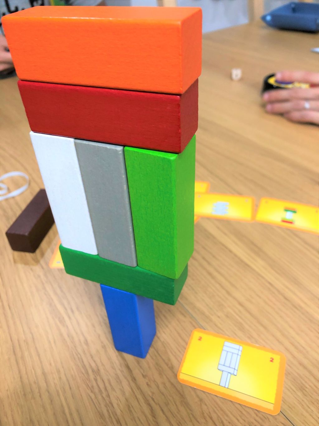タイマーでカウントダウンをスタートすると、お題カードをめくって組み立てます。色が指定されている場合と指定されていない場合があります。