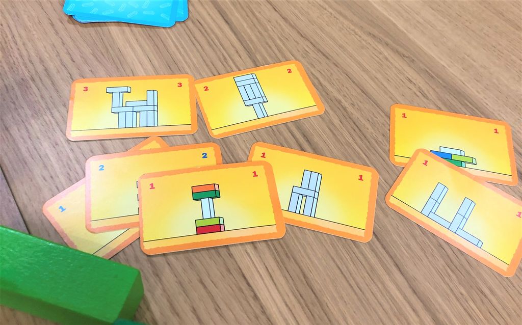 お題カードの種類もたくさんあり、動物の形に見えるものや上に重心があるもの、同時に乗せないと落ちちゃうものなど様々で、飽きないようになっています。