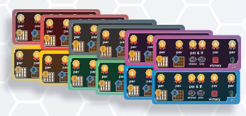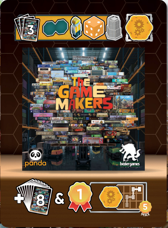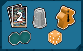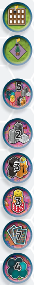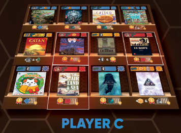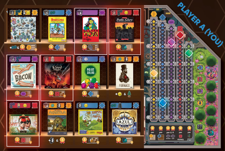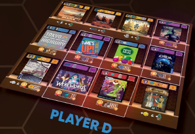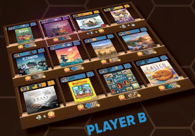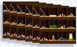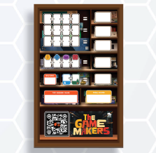 ディスプレイケース6つ 各プレイヤーは、製作したゲームを展示するディスプレイケースを1つ受け取ります。いずれかのプレイヤーがディスプレイケースに12個のゲームを完全に埋めると、ゲーム終了がトリガーされます。 |