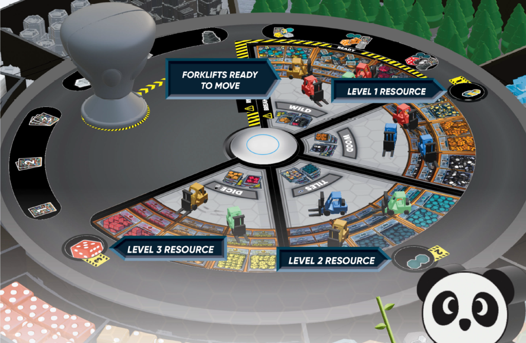 「READY」スペースからすべてのフォークリフトを移動したら、ステアリングホイールをいずれかのプレイヤーのフォークリフトがある次のウェッジまで回転させます。これにより、以前のウェッジが覆われ、利用可能な3つのリソースが変更されます。新しく「READY」が来たウェッジにあるフォークリフトは、利用可能な3つのウェッジのいずれかに割り当てて、対応するレベルのリソースをただちに受け取ることができ、それがコンポーネントか会社の資産かを選択します。いずれかのプレイヤーがディスプレイケースを完全に埋めてゲーム終了がトリガーされるまで、このプロセスを繰り返します。