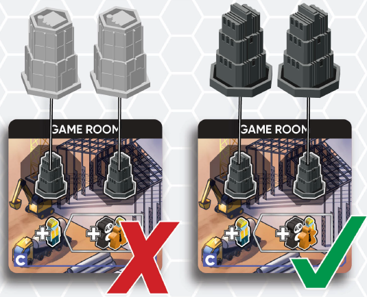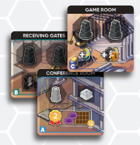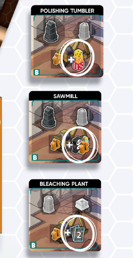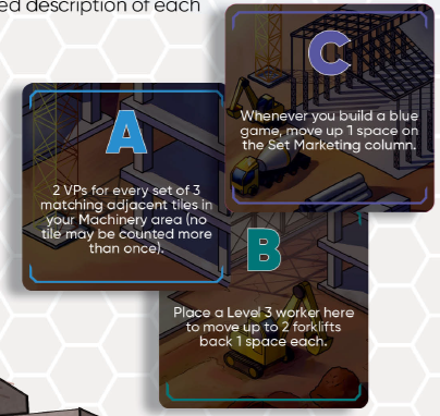 コンポーネントは、工場のコンポーネントエリアにただちに配置されます。会社の資産は工場の他のエリアに配置され、ボードゲームをより効率的に製作するのに役立ちます。そのリソースをどうするか決めたら、後で変更することはできません。