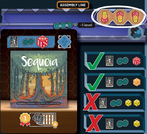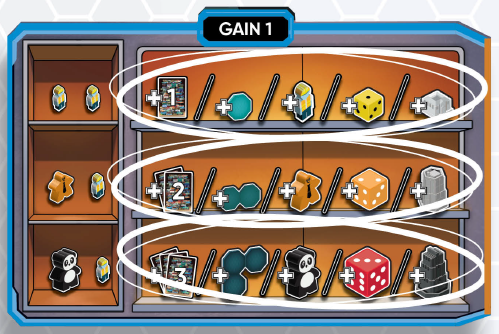 READYにあるフォークリフトを移動させて、レベル1の木製ピースか、レベル2のタイルか、レベル3のダイスを獲得します。 ステアリングホイールが回転し、フォークリフトが配置されているスペースがREADYになると、再び使用できるようになります。 |