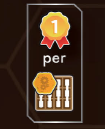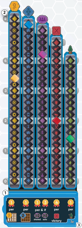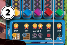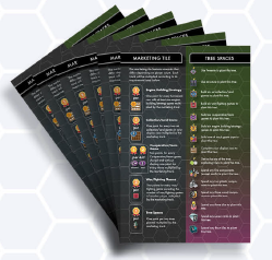 マーケティングタイル12枚+ソロプレイ用2枚 各プレイヤーは、自分の色のマーケティングタイルを2枚受け取り、現在のプレイヤー数に対応するタイルをマーケティングエリアの下のスペースに配置します。 |