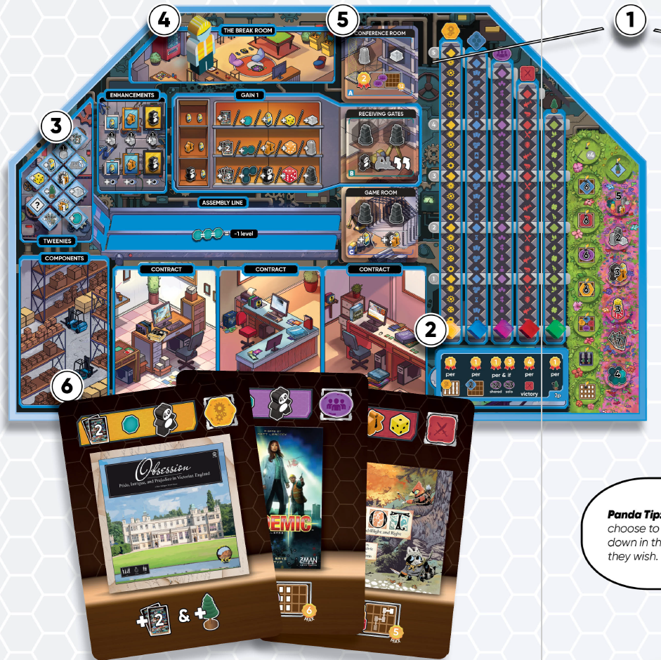 パンダのヒント: 序盤のターンをすべて工場の建設に使い、後でゲームを作ることに切り替えようと考えたくなります。ただし、誰かがショーケースを埋めるとゲームは終了することを忘れないでください。